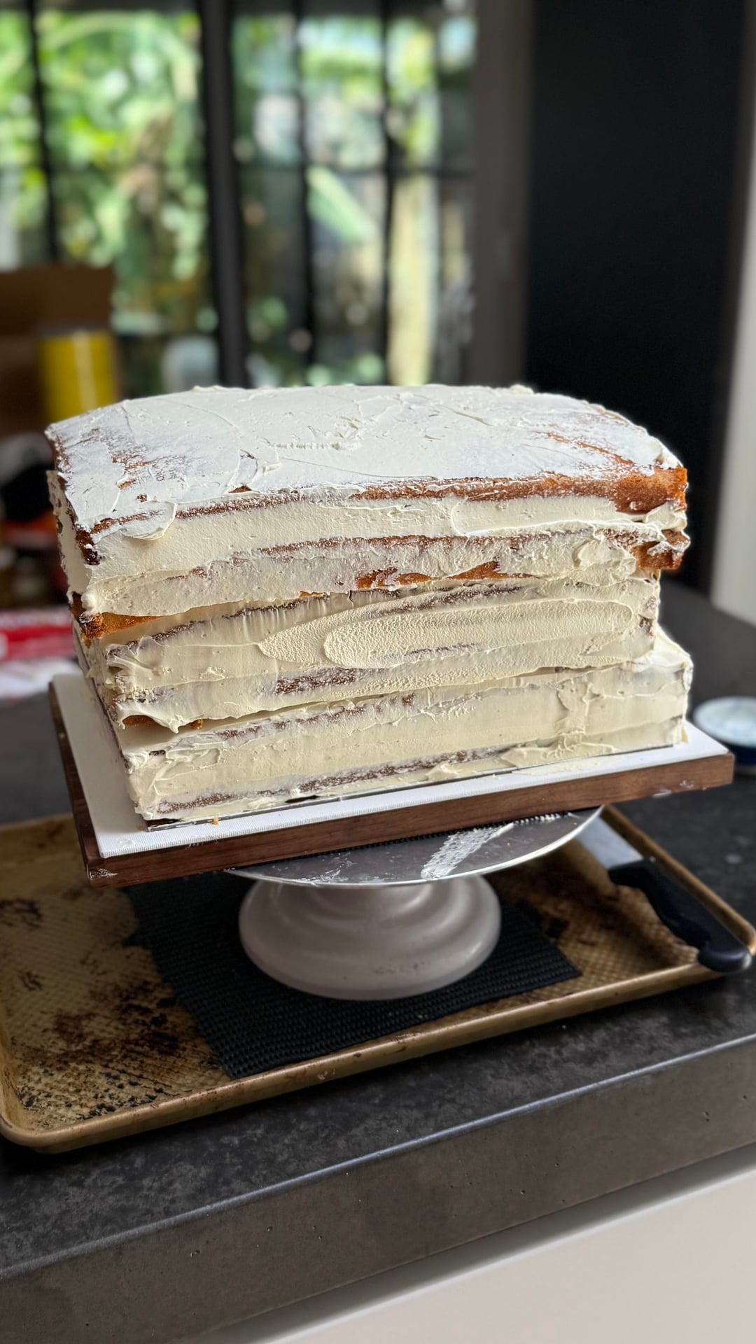 So it’s a stack of jumpers cake. Each jumper is its own individual lemon cake, filled with cherry jam, vanilla buttercream and crushed Shortbread Cream biscuits. The zip is edible too, if you felt the yen to (best not tho.) Swipe to the end to see the pre carved cake, and then the innards.