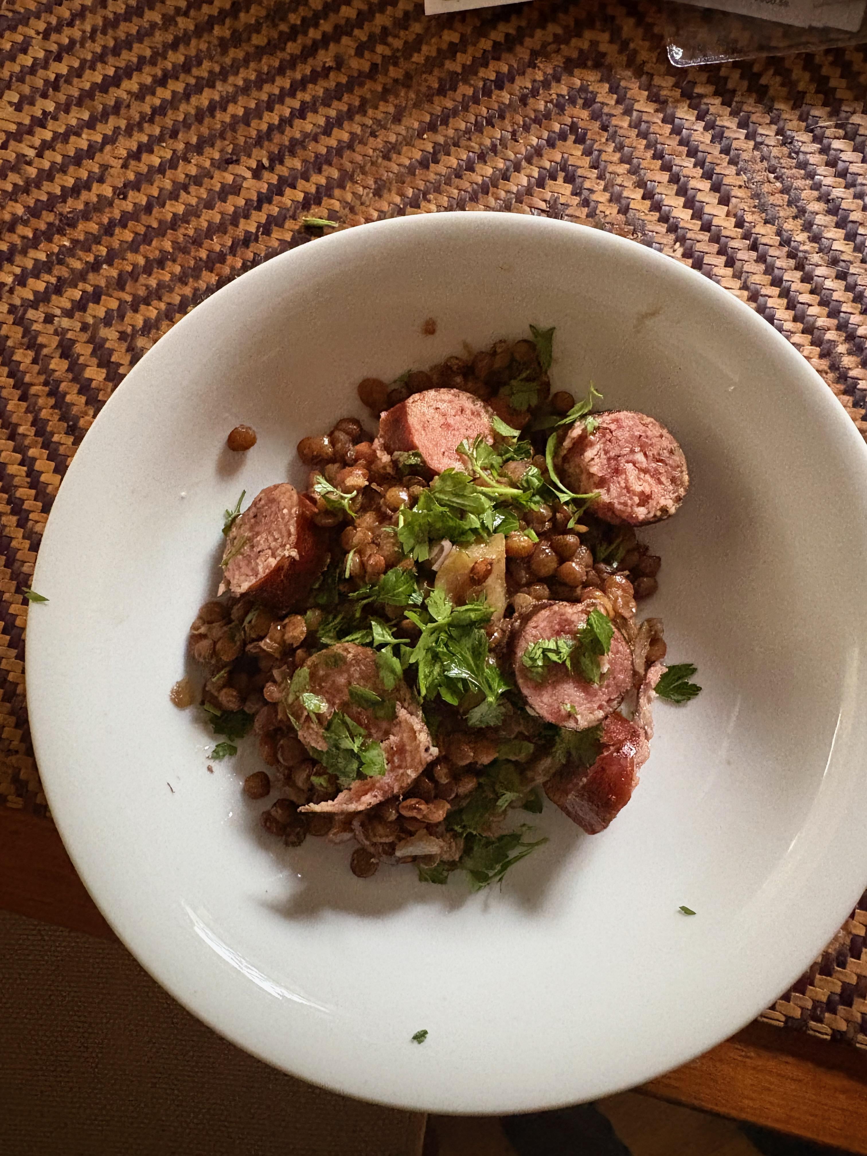 I am doing a pre-holiday kitchen purge. Lentils in pantry. Sausage in freezer. Apple of unknown antiquity in fridge. Just made a vat of turkey broth. Sautéed a mirepoix for another recipe & used it here.