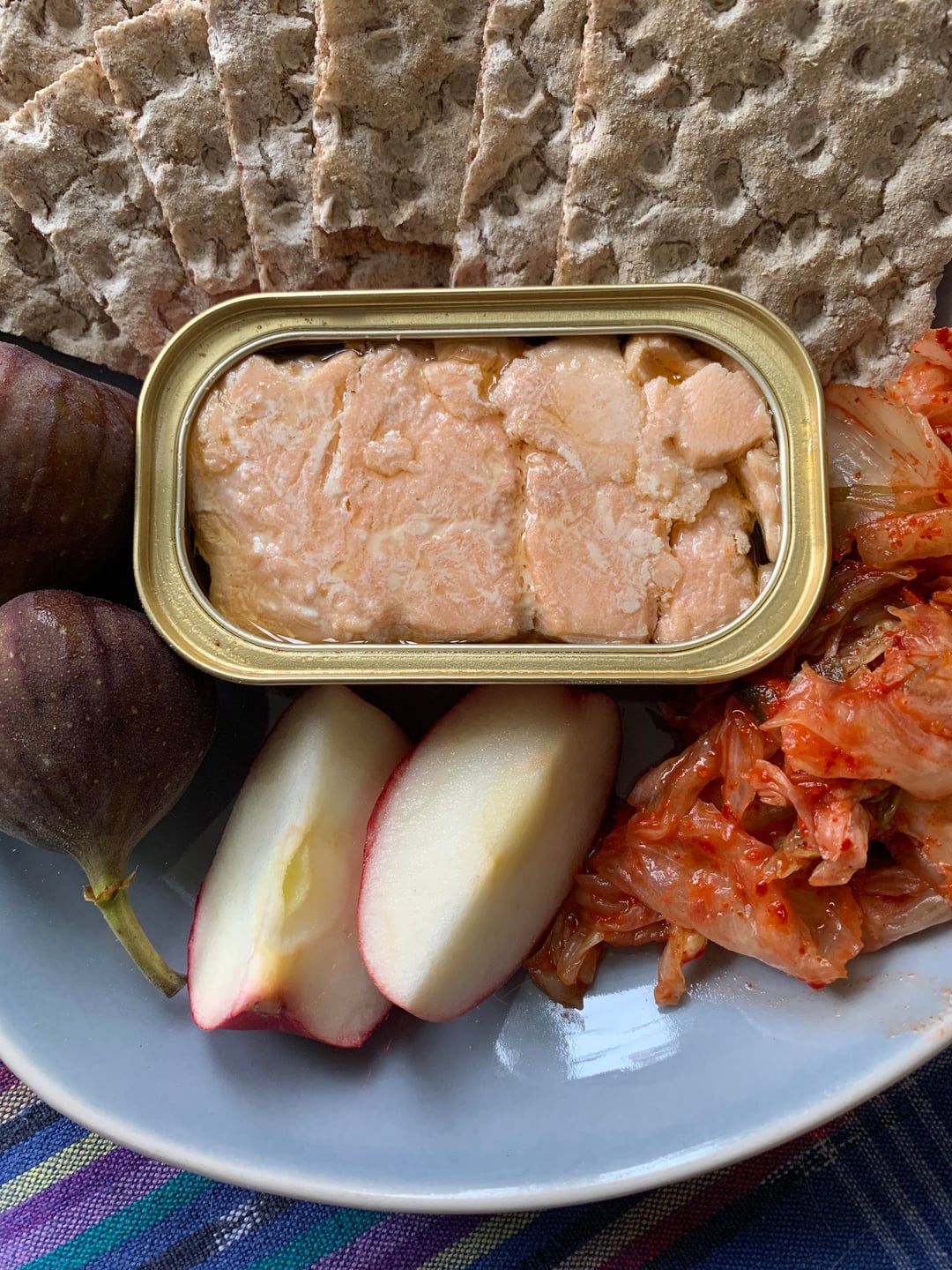 My first time with King Oscar salmon. Lovely flavor (I may add a bit of mayo, make it more of a salad. I'll consult with the cat. )Wasa light rye crisps, kimchi, turkey figs, baby apples.