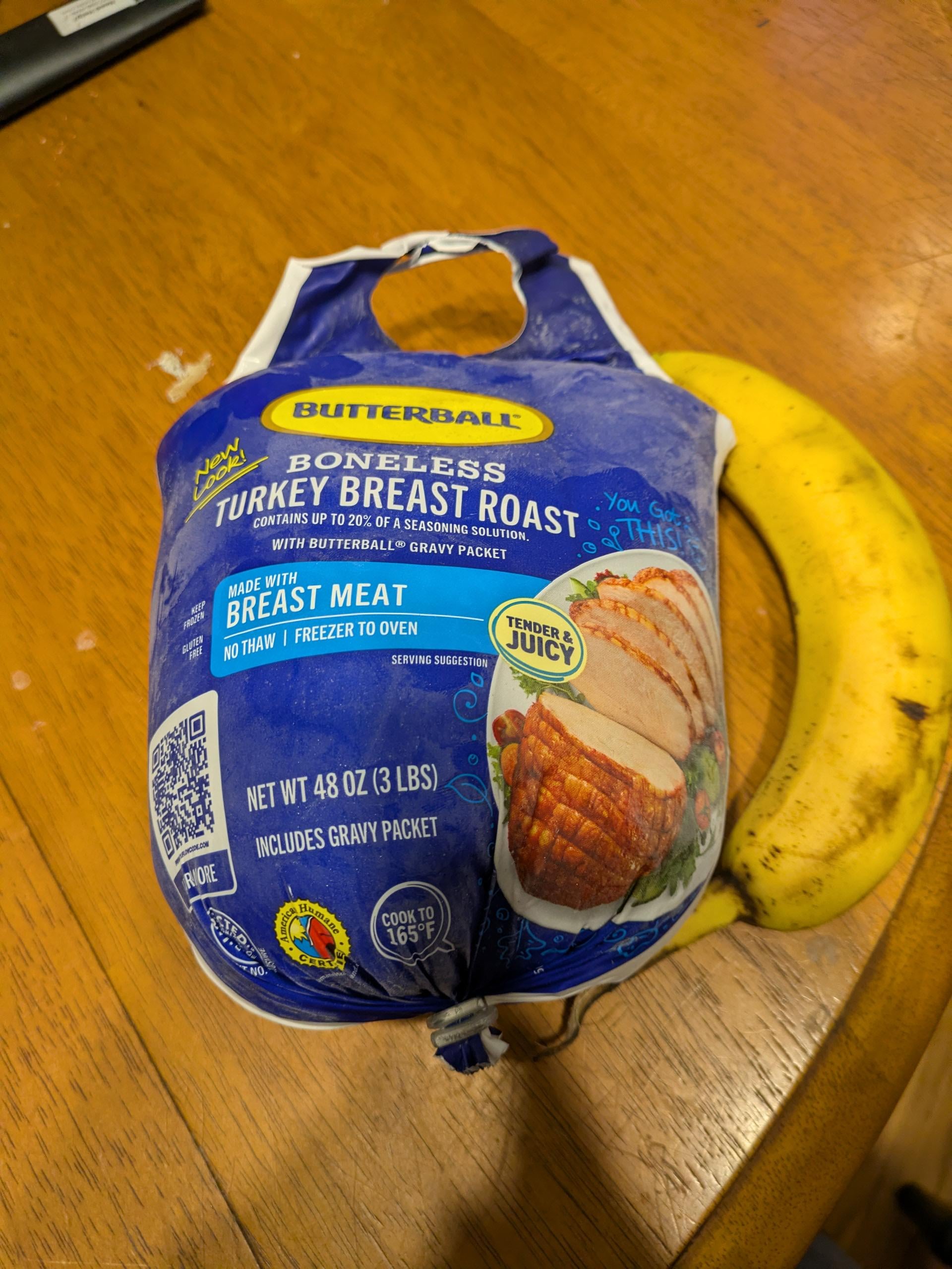 A 3 lb. breast I would honestly just do sous vide. When it says, “MADE WITH BREAST MEAT,” it means it’s a bunch of white parts that are formed into a mold. That’s why there’s a cooler full of exactly 3 lb. turkey breast roasts.