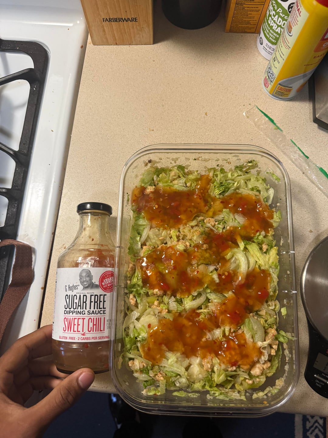 Then the NEXT day, i said you know what? Why not just bring half a lb of shredded lettuce with me for even more volume. And I’ll throw in some extra sauce for taste. Through the lettuce in their right before I was about to eat it (so it didn’t get mushy) and it came out incredible! I was honestly just planning to eat for fuel, not for taste with this meal but the g Hughes sweet chili sauce definitely worked overtime! I had people telling me how good that looked/ smelled and didn’t even know what it was haha.