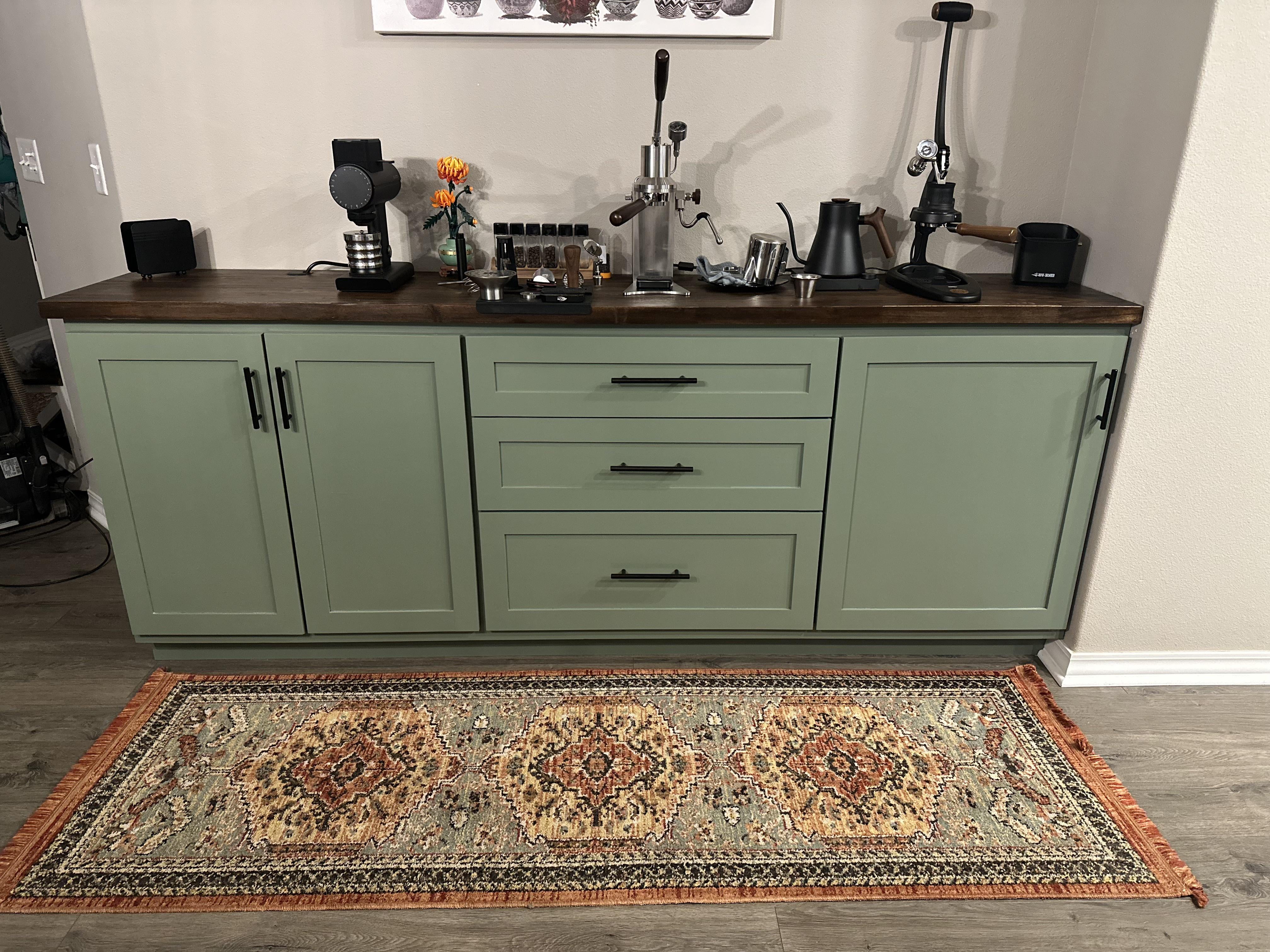 Looks amazing. I have a little space between the kitchen and dinning room to put a small coffee shelf/desk/trolley but the Mrs is against it. So I have my coffee machine in the cupboard lol.
