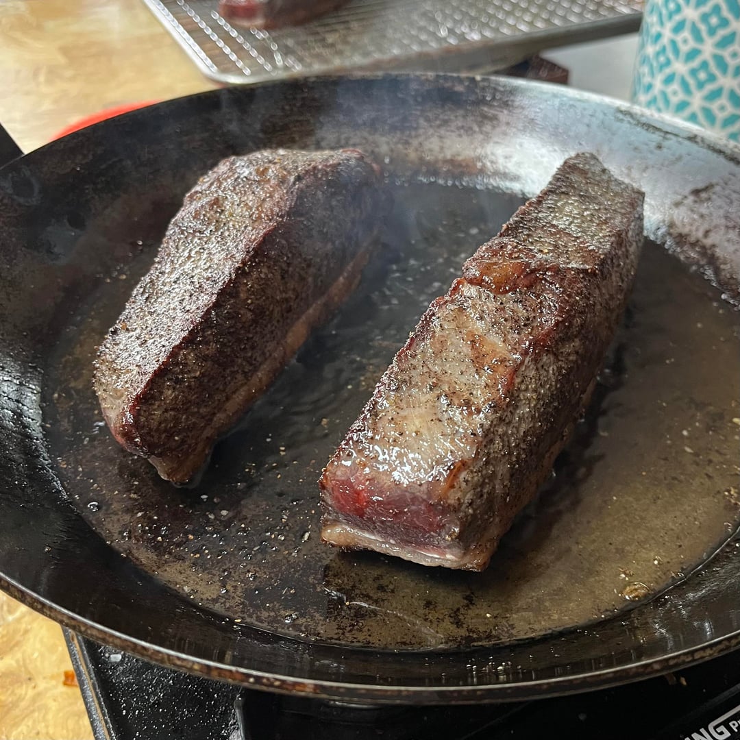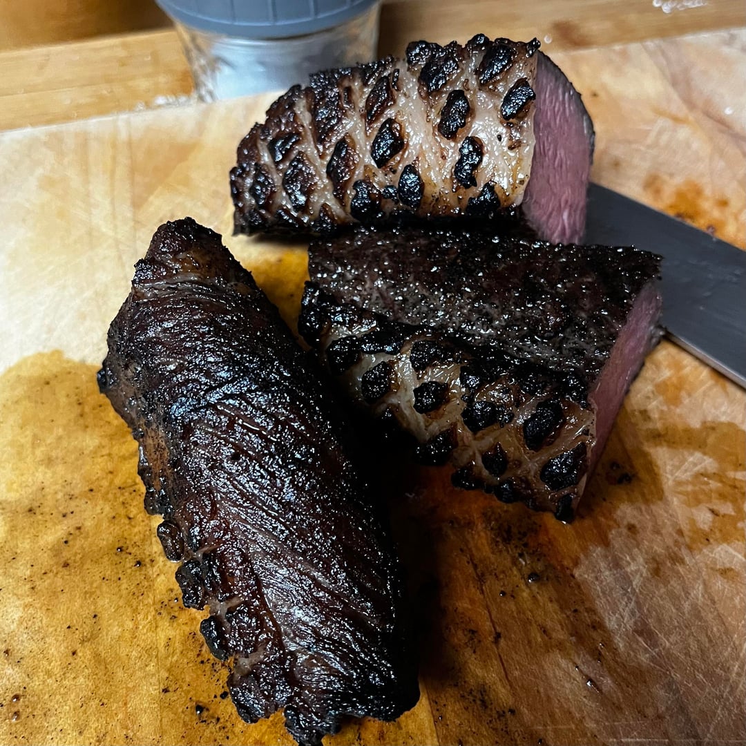 Pictures in order — sliced with the grain, seasoned all sides (thin unseasoned is for the dog), pre-searing, pre-seared, prep for sous vide, edging, charr-bonized crust, bonus dog’s steak.