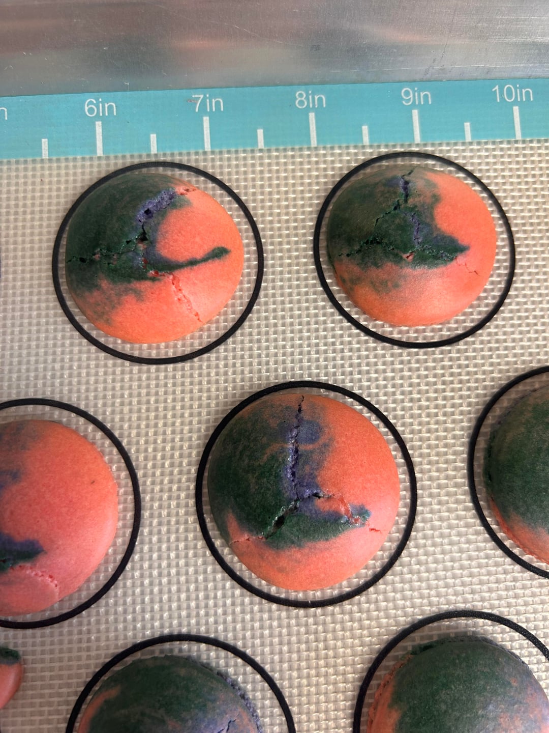 10/30 of my macs on this tray came out cracked like this. The rest normal. I’m doing French method. Baking one tray at a time. 300 degrees F (I have a thermometer in my oven to be sure) at 19 minutes. Seems like whenever I bake less time than that they stick to the mat and are undercooked. The other two trays I baked (same batch) only had one or two cracked shells. I rest them before baking for at least 45 minutes, probably closer to an hour though. Help? Thanks in advance!