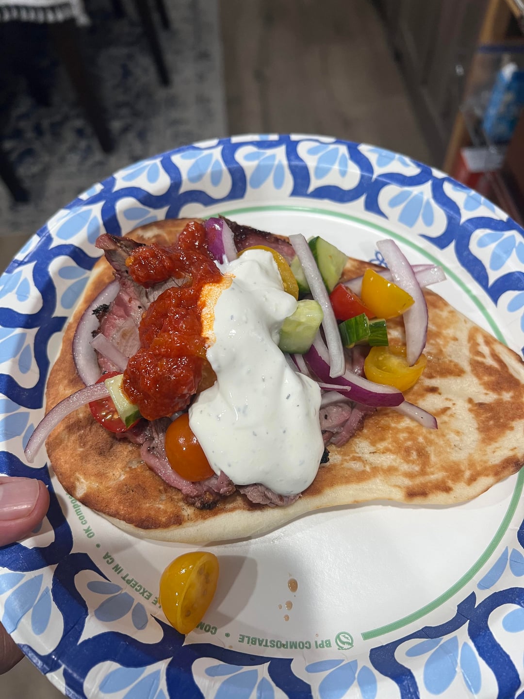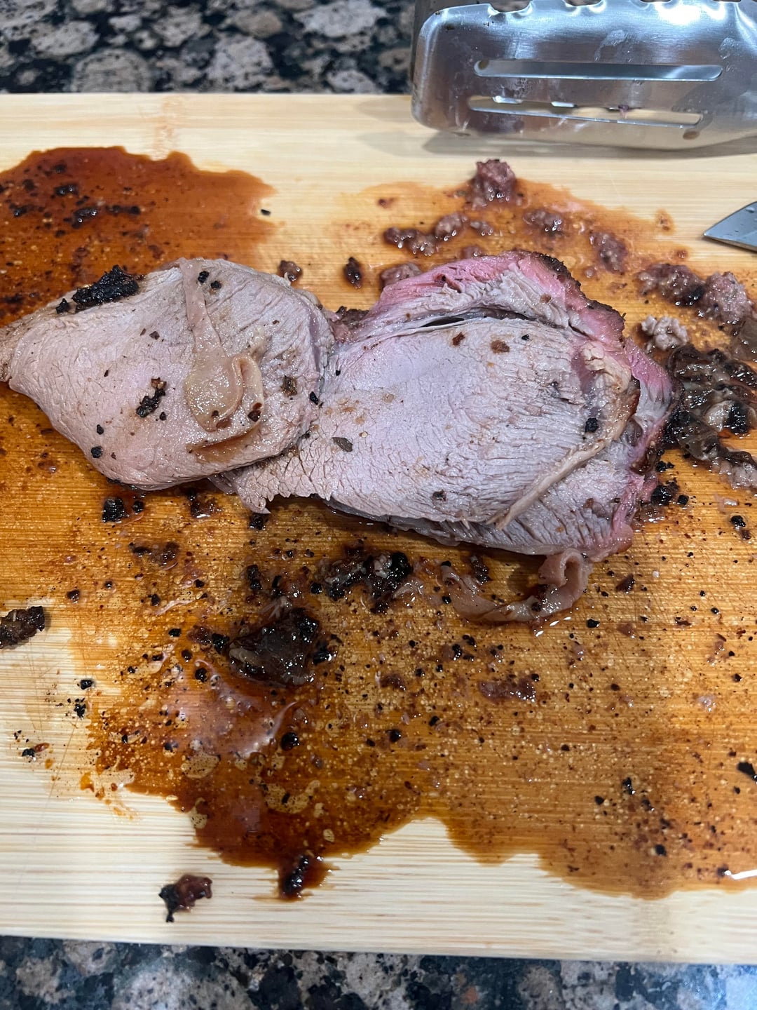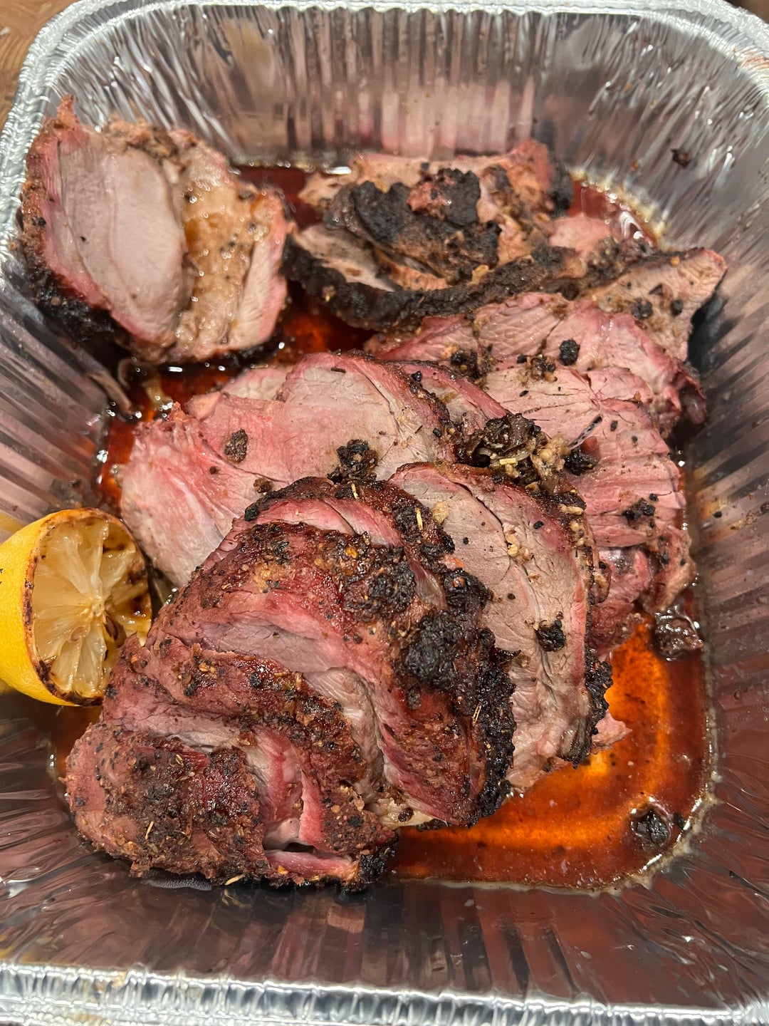 Smoked boneless Leg of lamb 🐑 on the Traeger. Made wraps with a veggie salad, taziki sauce, and Mina harissa hot pepper sauce.