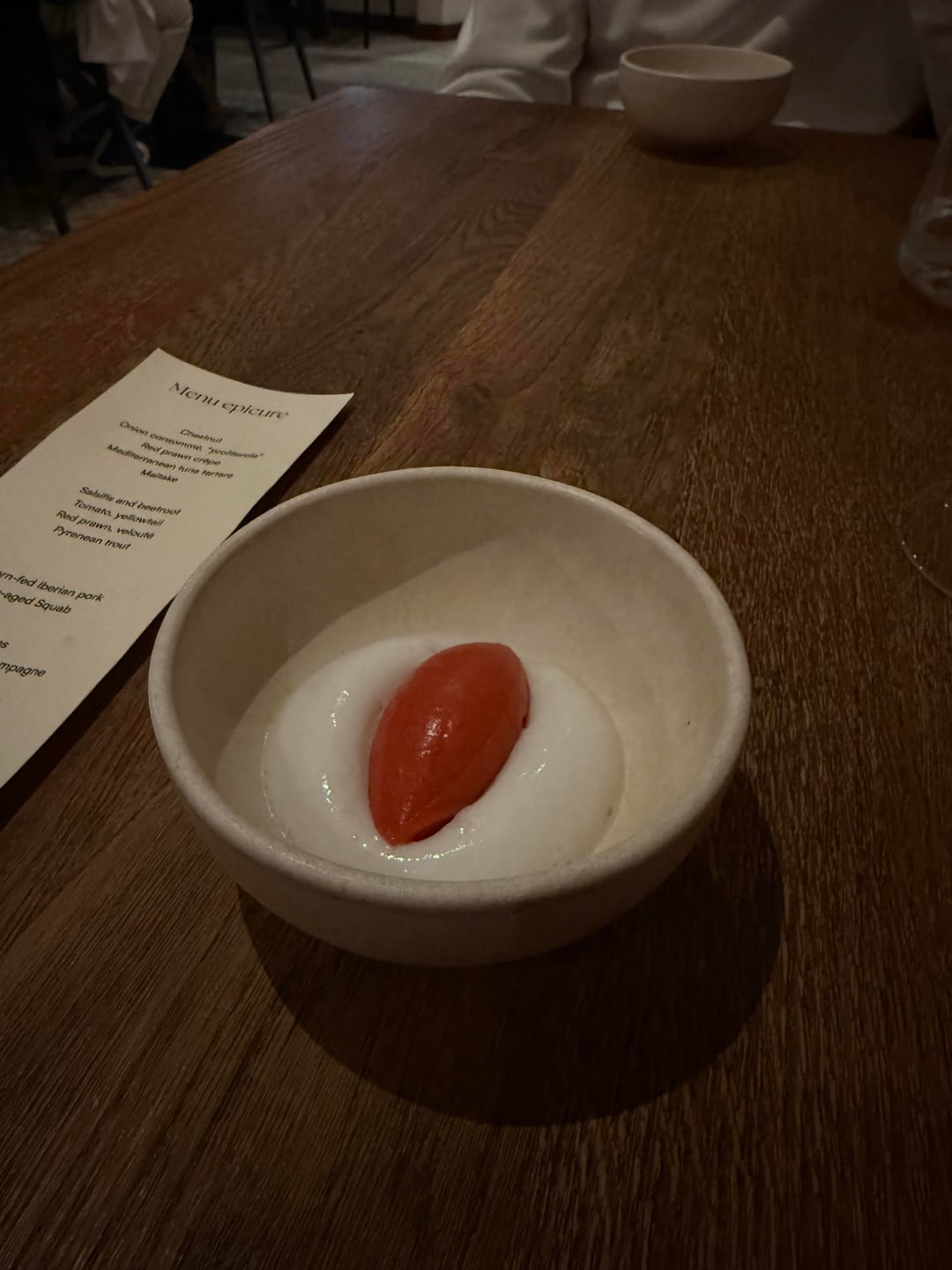 Dish 2 – 10/10 – sea crepe (shrimp), aged bluefin tartar, onion soup, cheese profiterole. The sea crepe and tartar were incredible. In Seattle we are blessed with incredible seafood, though this was the best tuna I have ever tasted. The tartar is laced with picked veggies, and it was a wonderful bite. I could eat a full meal of these.