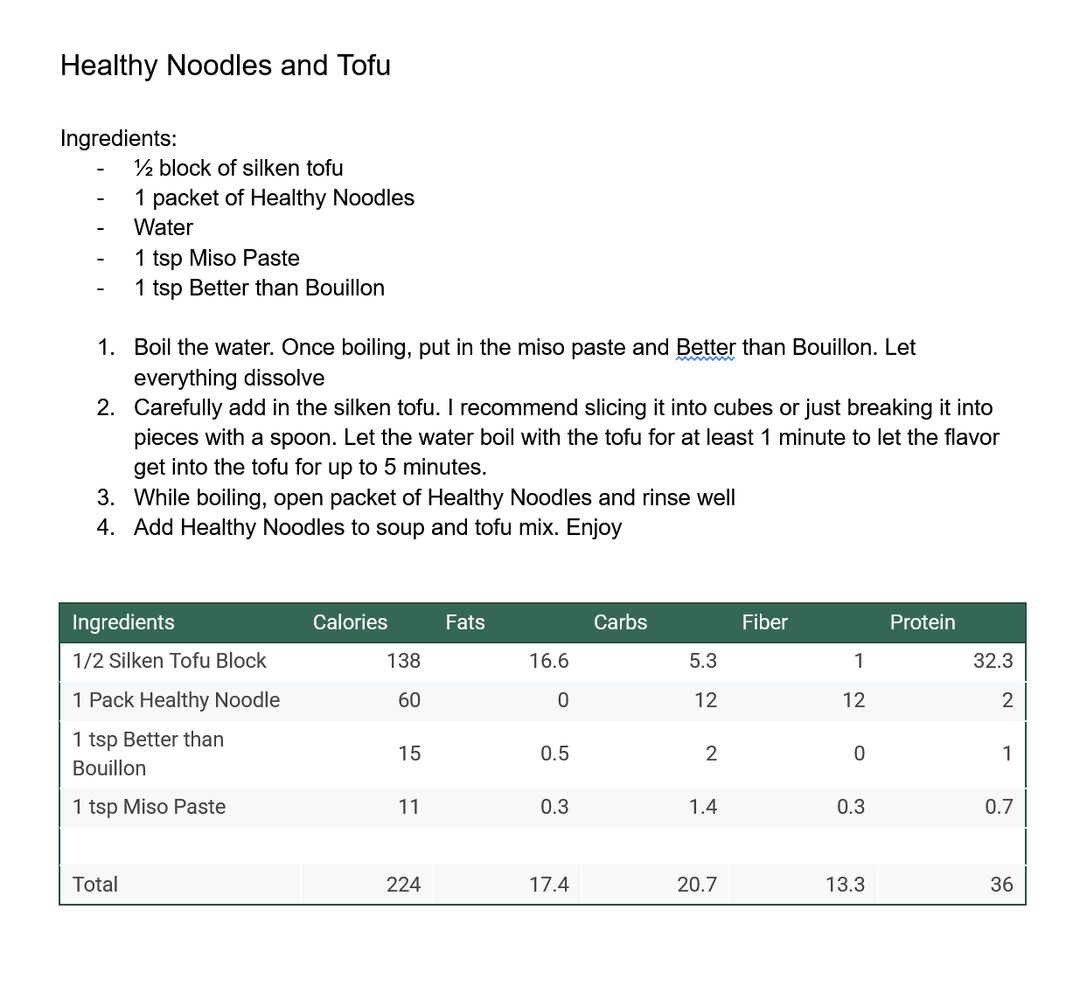 Also, just a heads up, I'm not affiliated or sponsored, but I did specifically use the Healthy Noodles. One pack is 2 servings or 60 calories. Really helpful for people like me who love ramen and miss noodles. This is a nice, quick meal I make for after my long as hell 12 hr shifts before I pass out since it's about 15 minutes (at most) to make.