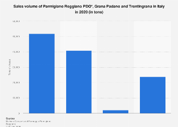 Consorzio del Formaggio Parmigiano-Reggiano. (January 26, 2022). Sales volume of Parmigiano Reggiano PDO*, Grana Padano and Trentingrana in Italy in 2020 (in tons) [Graph]. In Statista. Retrieved November 20, 2025, from https://www.statista.com/statistics/982398/sales-volume-of-parmigiano-reggiano-and-grana-padano/