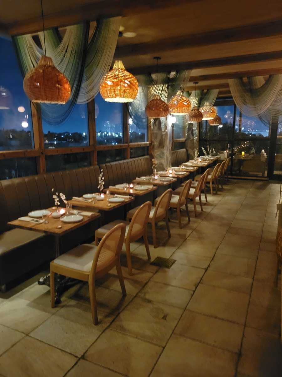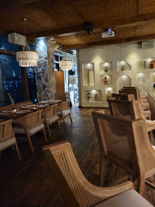 The venue, inspired by destinations such as Southern Italy, the islands of Greece, and coastal Morocco, features a low-lit bar area and tables adorned with flowers, set amidst drapes the color of the sea and orange wicker chandeliers. Each table is accompanied by a different view of the city skyline, perfect for a date night, meeting with friends or a special occasion. The venue has a list of beer, wine, mocktails and signature cocktails with unique presentations, like the Sunrise in Santorini, made with Ciroc Red Berry, Grey Goose Watermelon Basil, cranberry, and peach schnapps, or the Royal Aura, made with Bacardi Spiced, coconut cream, kiwi, orgeat and bitters.