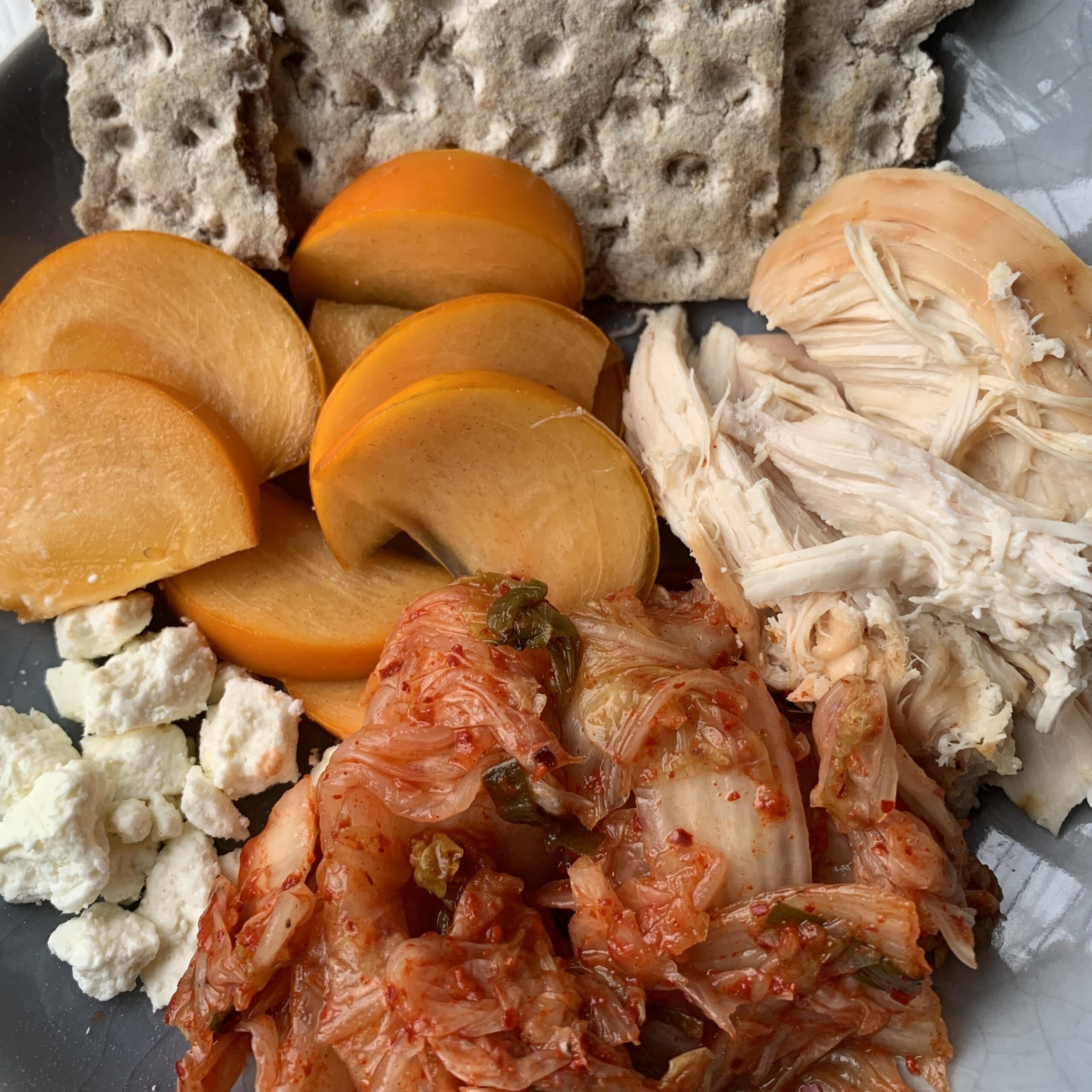 Costco chicken breast, kimchi, Fuyu persimmon, feta crumbles, Wasa light rye crisp. I know the chicken has more sodium than ideal but once in a while I indulge. Went to Costco in search of the tinned fish deals I've seen posted; alas, not at my store. 🙃