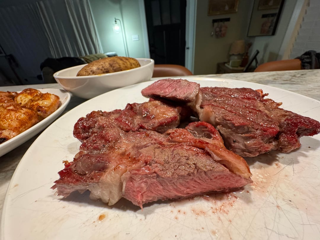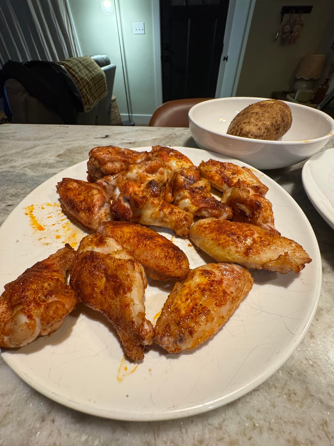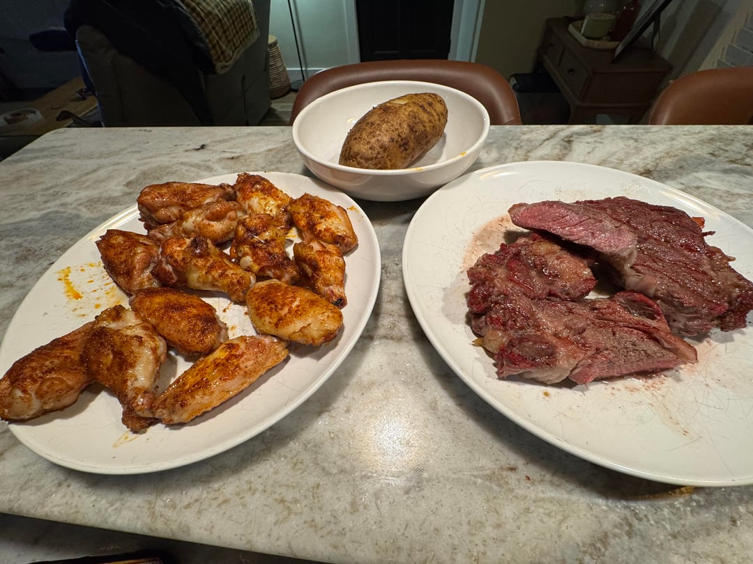 Didn’t do anything fancy, got a ribeye steak, handful of wings, and a potato. Super smoked at 225 for 40 min then removed the meat, cranked to 500 and seared for about 3 min each side (both steak and wings). Internal temps came to about 125 for steak and 170 for wings.