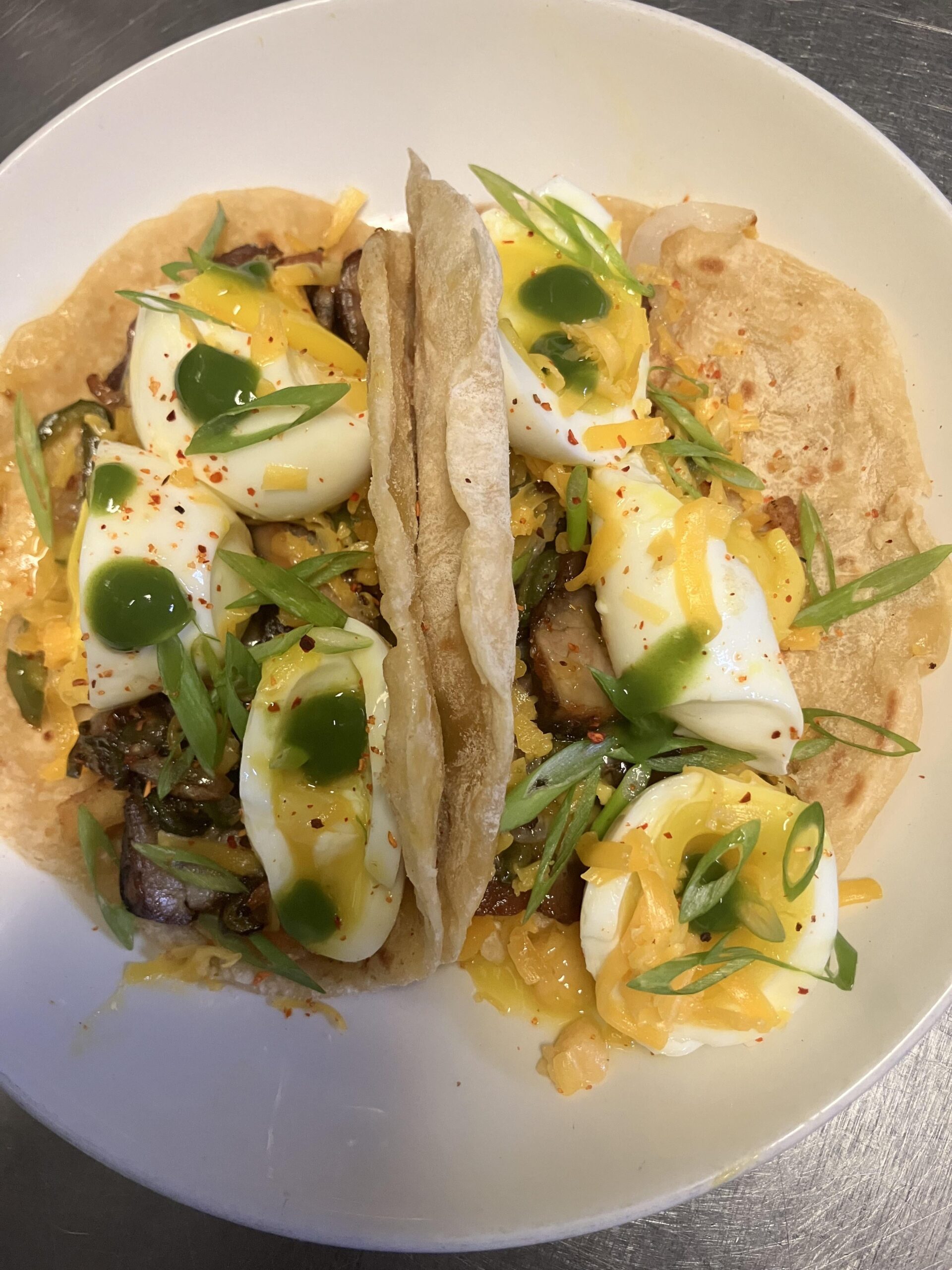 for your consideration: bacon, potato, cheese, grilled red onion and jalapeño, tajin, green picamas sasla brava…clare butter tortillaby fistmelupus Dining and Cooking