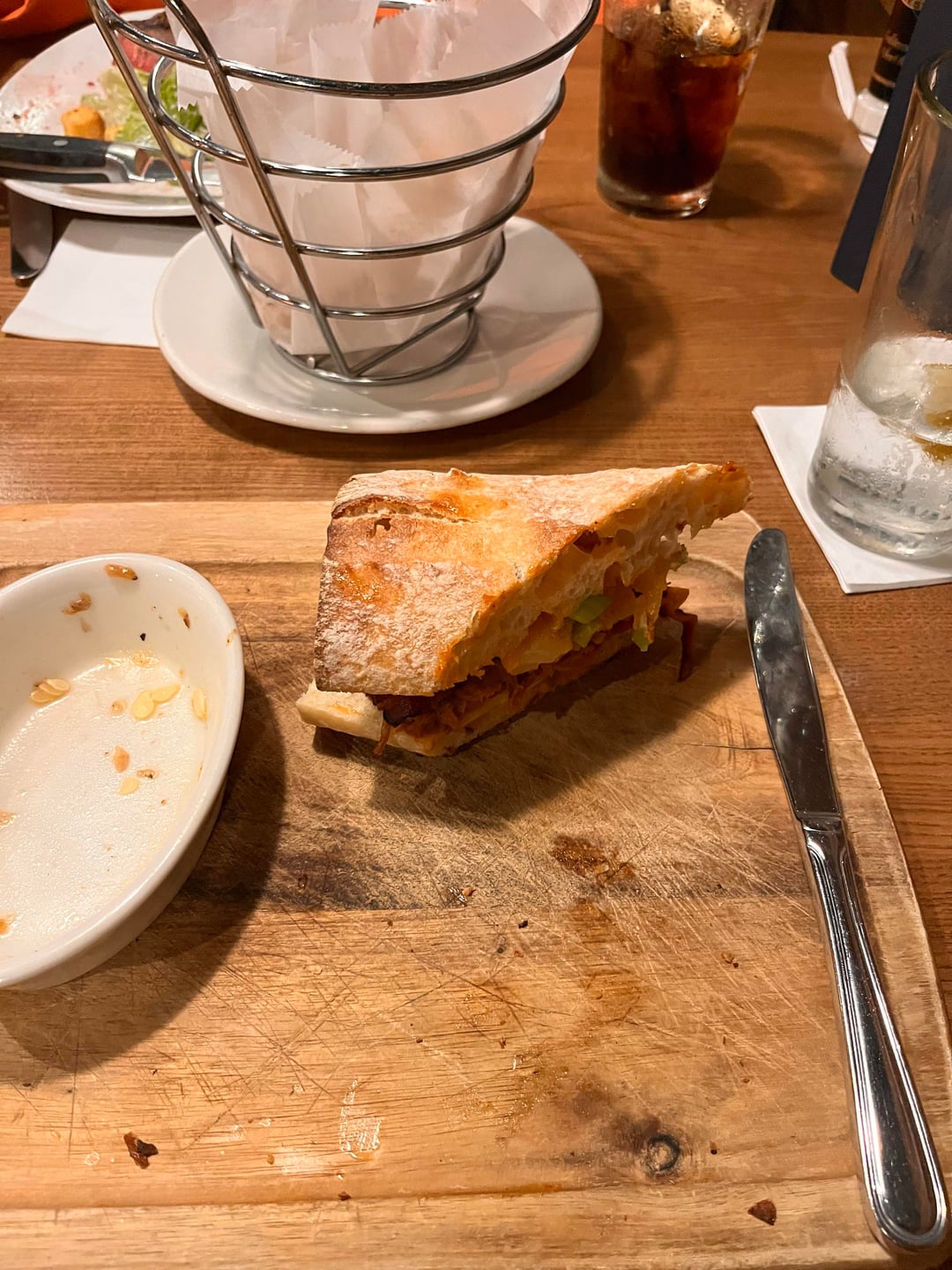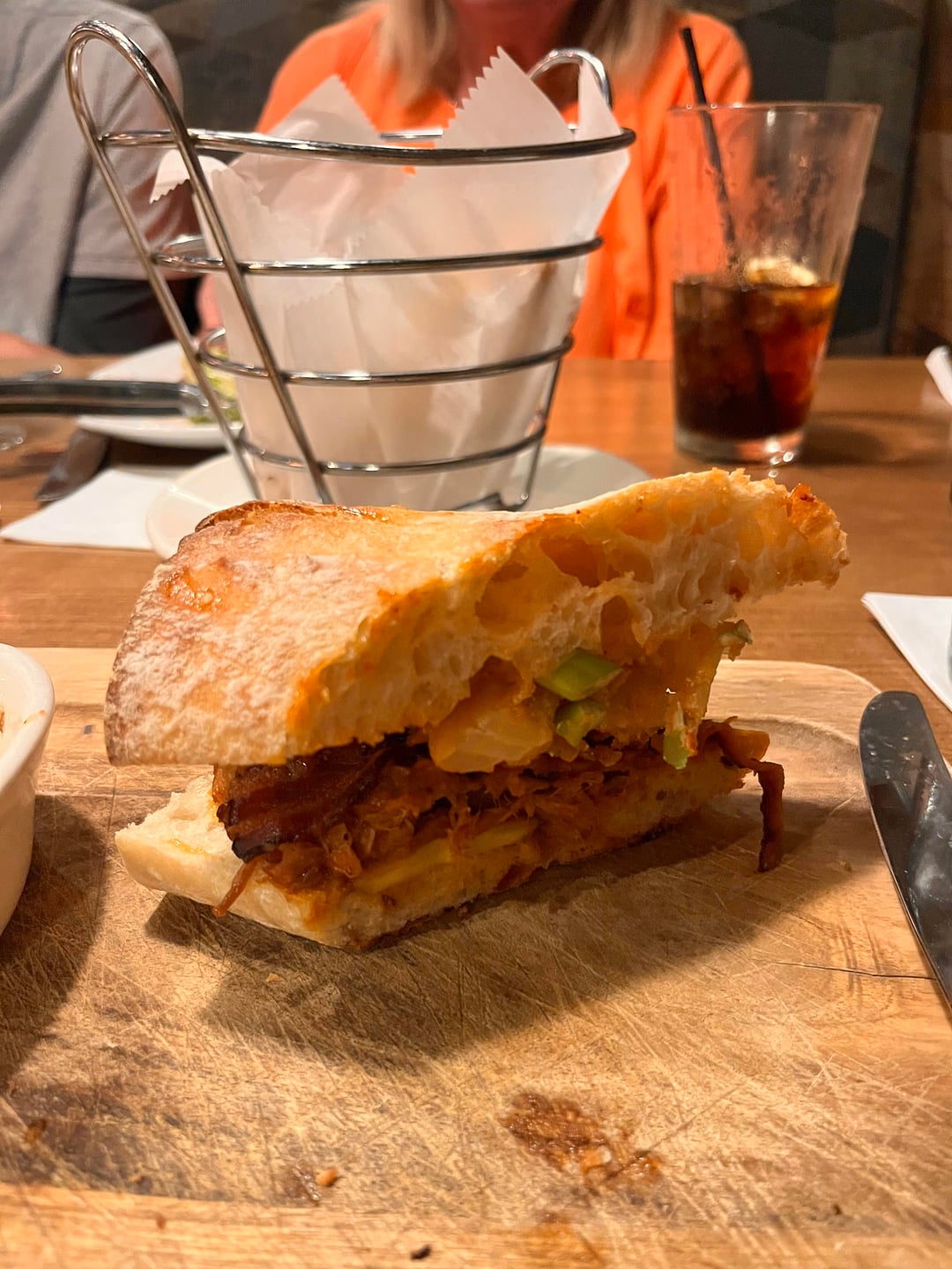what’s in it: Chipotle bbq pulled pork. honey chipotle aioli, fried onion straws, pickled sweet and hot pickles, green onions, French bread.