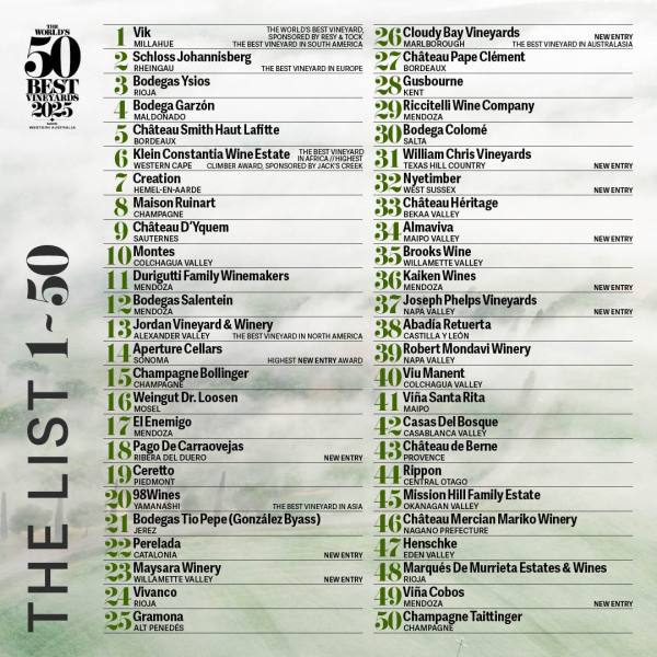Along with Cloudy Bay Vineyards, a total of 11 vineyards made their debut onto the list this year, including Pago de Carraovejas (No.18) in Ribera del Duero, Spain; Perelada (No.22) in Catalonia, Spain; Maysara Winery (No.23) in Willamette Valley, USA; William Chris Vineyards (No.31) in Texas Hill Country, USA; Nyetimber (No.32) in West Sussex, England; Almaviva (No.34) in Maipo Valley, Chile; Kaiken Wines (No.36) in Mendoza, Argentina; Joseph Phelps Vineyards (No.37) in Napa Valley, USA; and Viña Cobos (No.49) in Mendoza, Argentina.