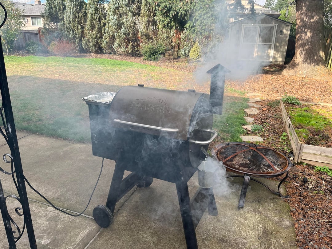 3 hours on the traeger until the flame went out (been lazy and it needs a cleaning). So I had to transfer and finish in the oven.