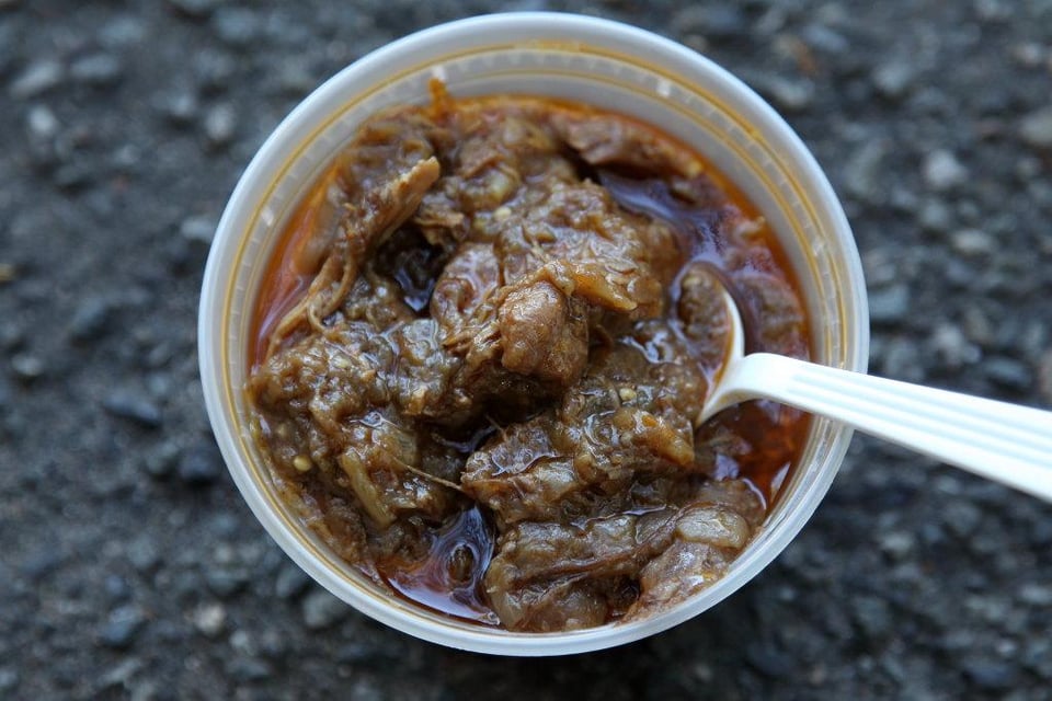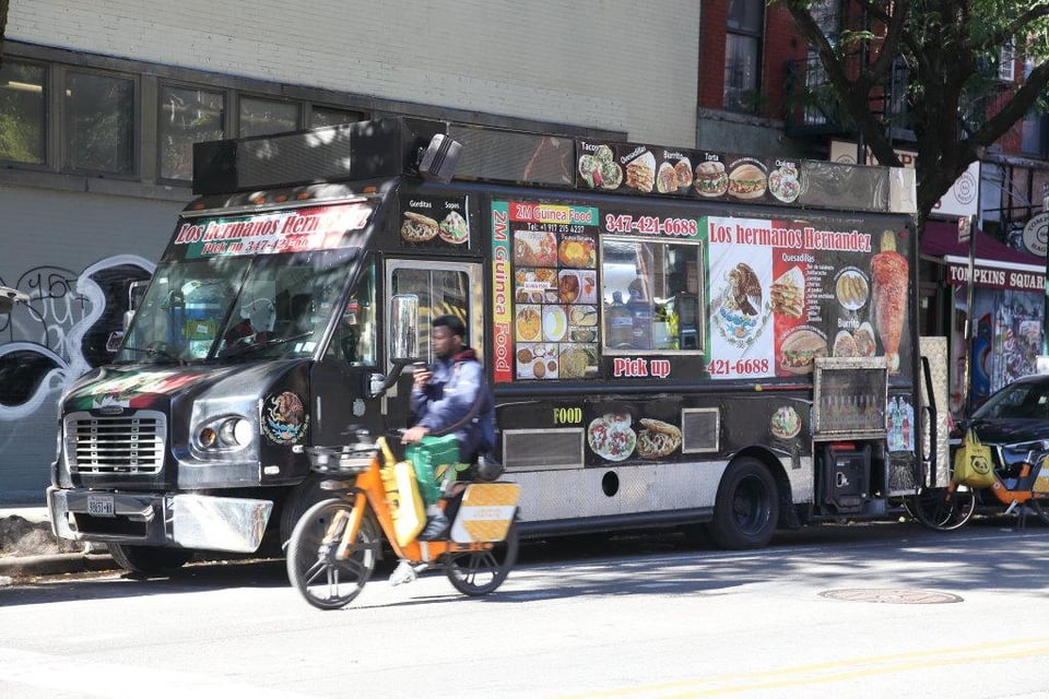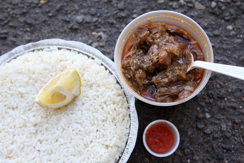 Magangni, eggplant-and-okra stew loaded with lamb, from 2M Guinea Food. Hefty, especially the rice, for my $12. The truck, still wearing some old Mexican signage, parks on Ave. A just above Tompkins Square Park, near a bike-delivery hub that seems to supply most of its customers.