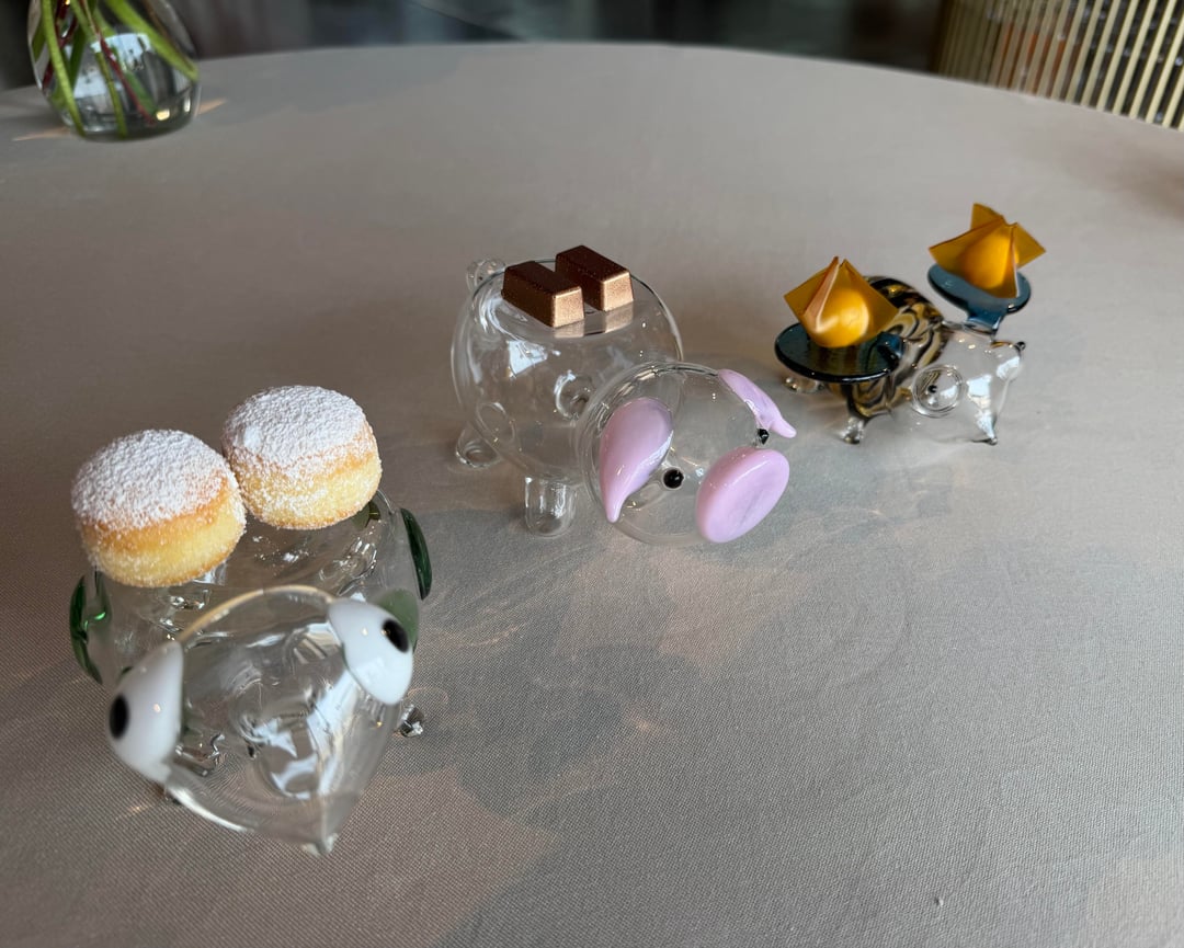1. Dessert was Banana served with ‘popcorn’ which they rolled out in a little popcorn cart like at the movies. The popcorn was frozen meringue and kind of stuck together with a kind of caramel. Was so light and tasty. Better than real caramel corn. The banana was tremendous and textured, layered, creamy, rich, cold and warm. It was one of the best desserts I have ever had. And just beautiful.