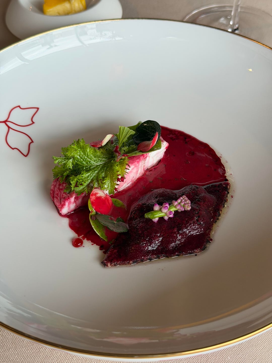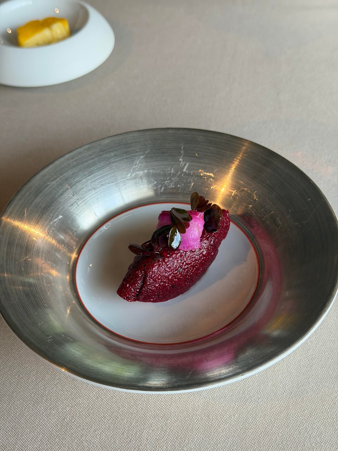3. Seaweed Crusted Turbot, beetroot and sea snails. They brought this out in two parts first was kind of taco(ish) with the fish inside and was almost like a whitefish salad. Great texture and flavor. Then brought out the piece of fish with the snails on the side blanketed by beetroot. Beautiful presentation, impeccable fish of course and loved the snails as an accompaniment.
