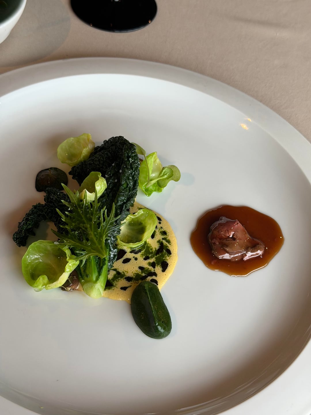 1. Duck, Hunchback and Miso, served in 3 parts. First was plated breast with kale, Brussels sprouts, hunchback/miso sauce with liver on the side. Followed by duck leg breaded and fried and some liberal gold leaf for show, a great bite. Finally a duck tortelli in broth that was the highlight of the course, unreal. With this series they also did a blind pairing, in an opaque glass which was ultimately a fine barolo, makes sense for Piedmontese wine with the hunchback bagna cauda. Definitely sparked some more conversation, and our sommelier continued to delight us with her knowledge and good spirits.