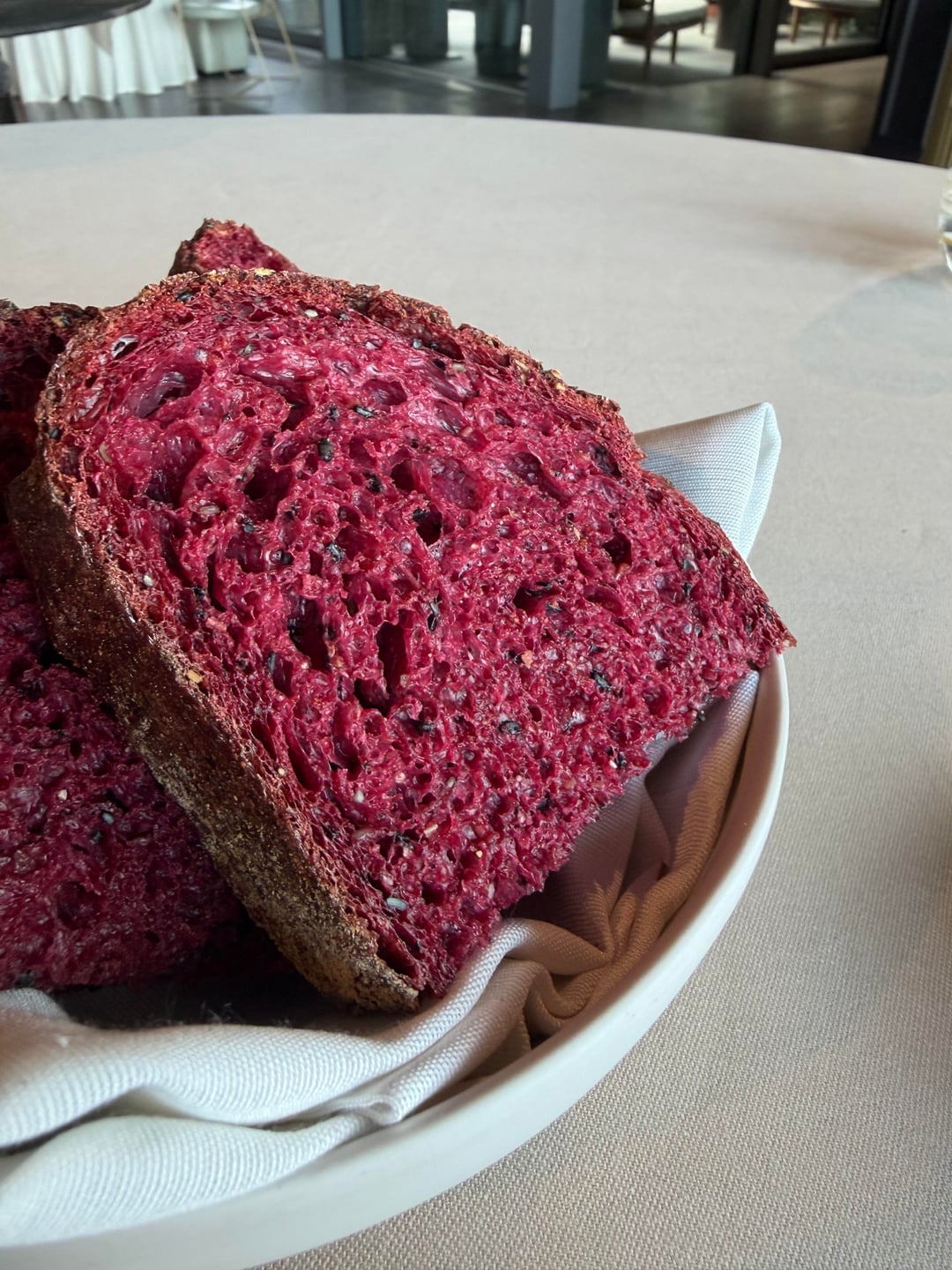 The first course of bread was made with spelt flour, purple carrots and red seaweed, accompanied by French butter flavoured with citrus fruits. Just amazing visually and tremendously flavored.