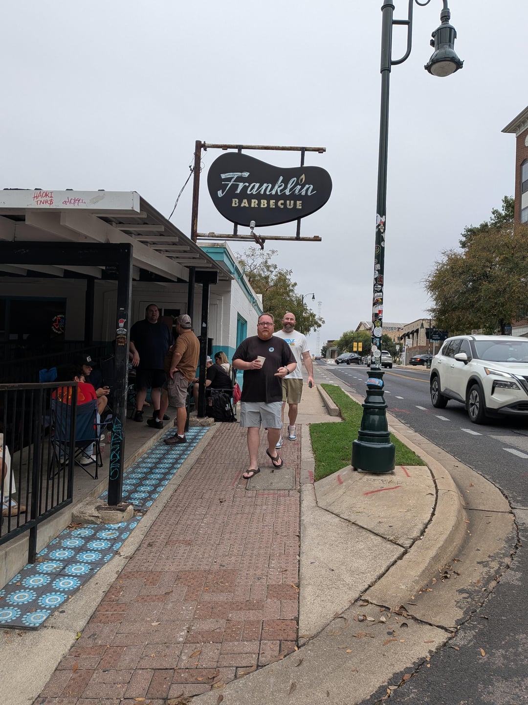First stop on our BBQ tour of Austin and Dallas. Franklin's in Austin. We got in line at 0845 and are under the patio with the line extending into the parking lot by 1000.