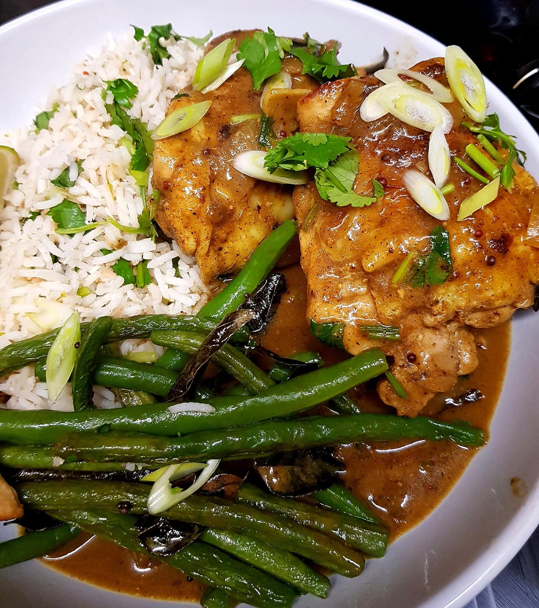 From Scratch. Xacutti Chicken Curry with Coconut Lime Chilli Rice, Flatbread and Garlic Green Beans with Mustard Seed & Curry Leaf Browned Butter.by pink_flamingo2003 2 Comments skaradontes89 1 week ago This post needs more appreciation. Definitely using all my senses to enjoy a meal like this LeahLeahLeah11 1 week ago Recipe?!