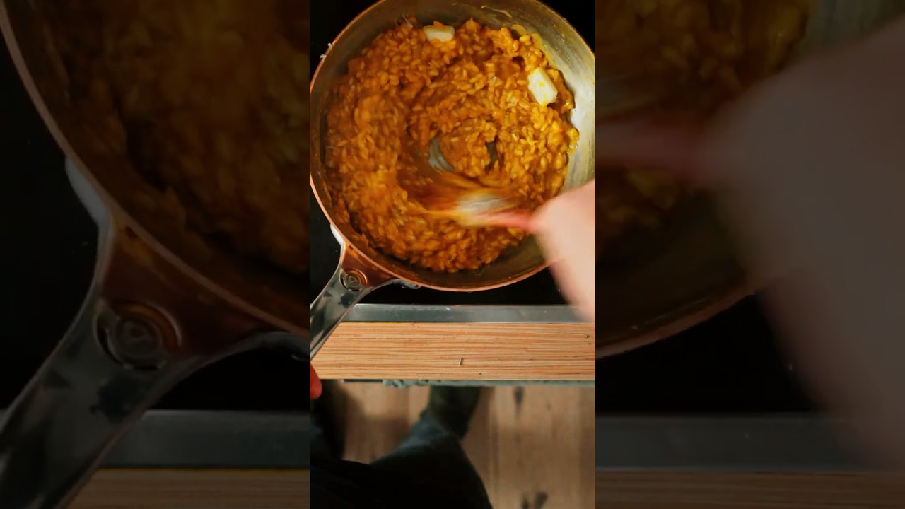 7. Gradually add the pumpkin purée, stirring constantly until the rice is creamy and al dente.