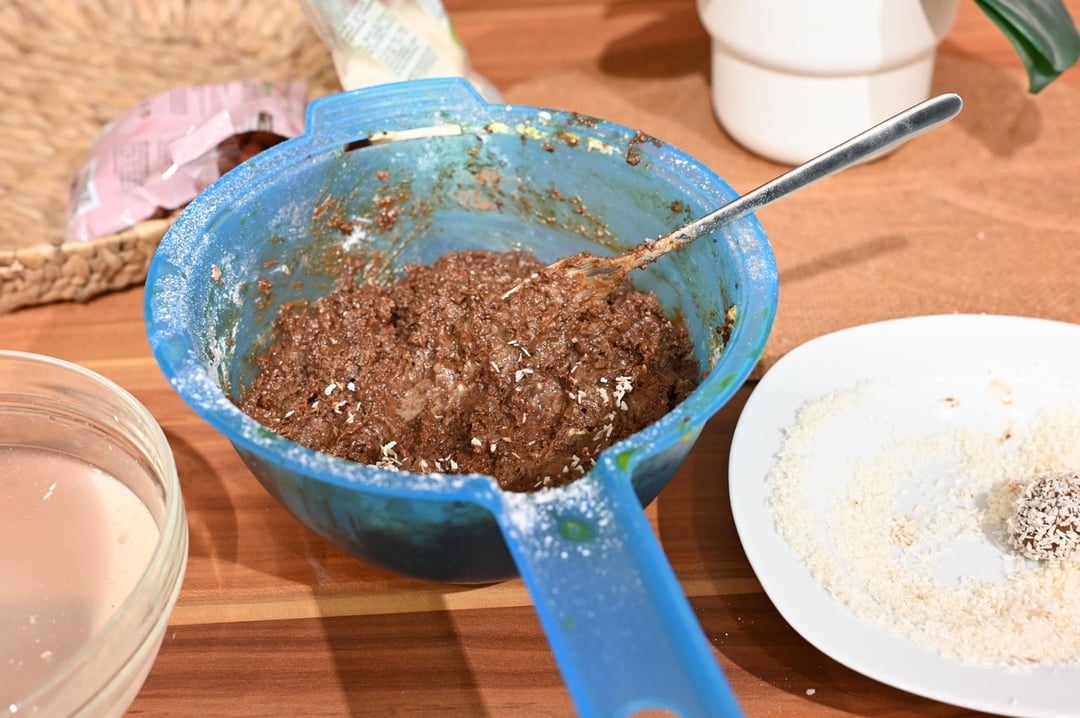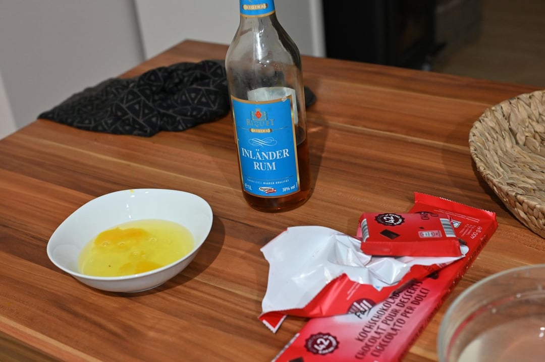 Rum balls are pretty easy to make and taste always very good. You only need some chocolate, eggs, some rum, sugar and coconut flakes. Since their main consistency is from butter and chocolate you don't need to cook them but keeping them cold in the fridge is a good advice.
