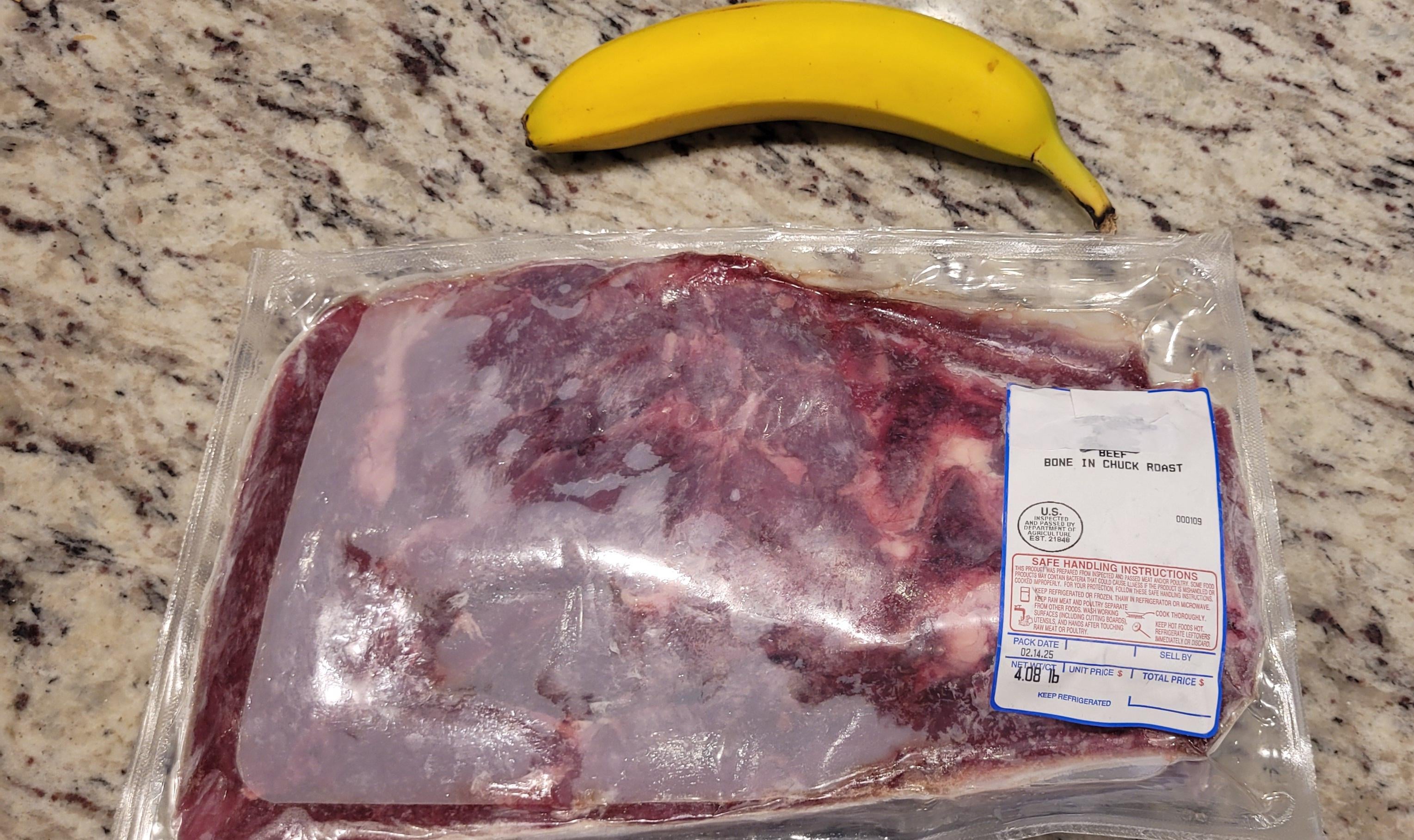 Have a look at my chuck roast from the freezer. Banana for scale 😆. Any sous vide recommendations to make it shine?