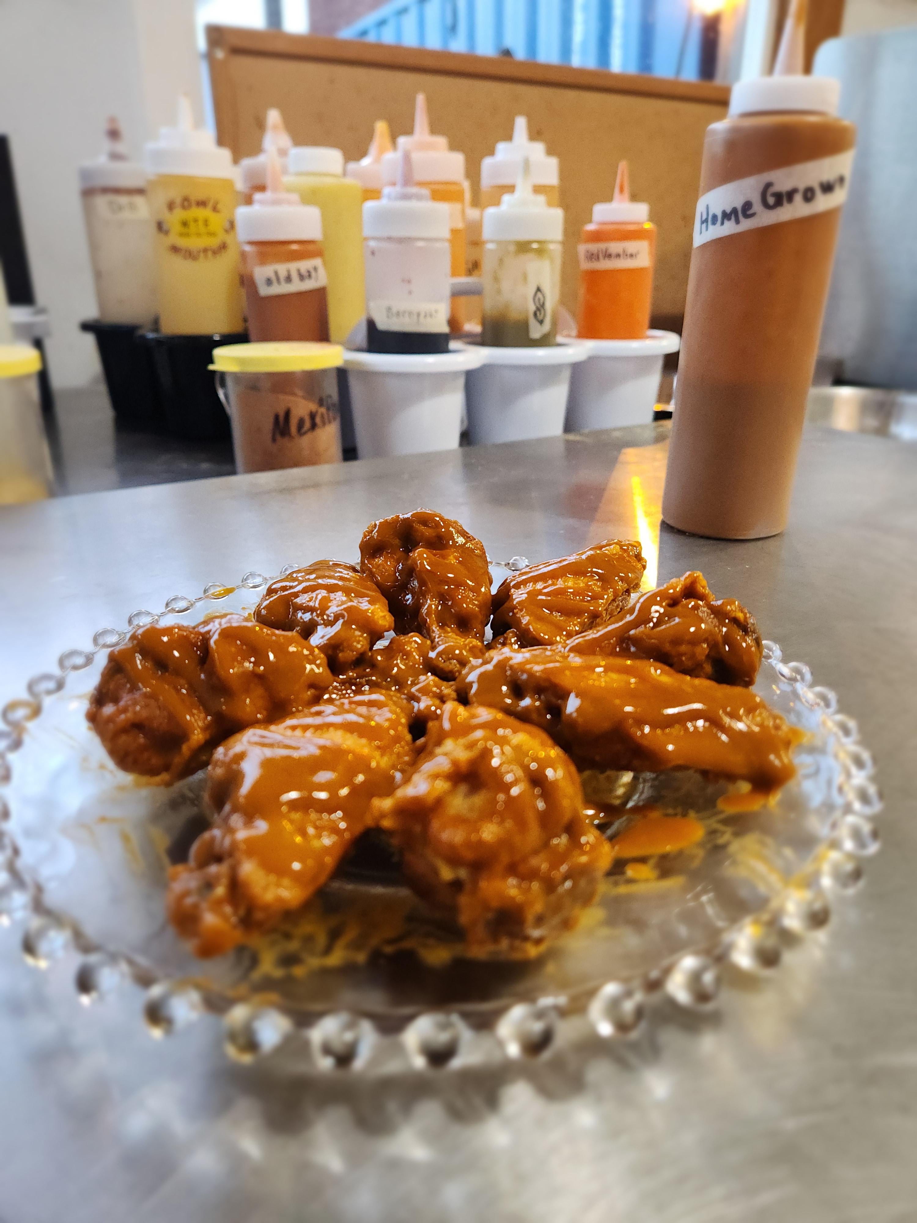 i got a whole arsenal of sauces, but I've never grown my own before. i live in the mountains. it's not quite hot pepper territory so i only produced a few handfuls of ripe jalapeños. i threw in the one cayenne – that didnt get dried, and a little ghosty that made it through the summer. simmered in vinegar, blended, strained, buttered; with a splash of (gluten-free) soy sauce. it was a little thick, but i like my flavor to stick. 10/10 i will do this again. also, it went better with bleu cheese than ranch. sauce to butter ratio was 4:1.