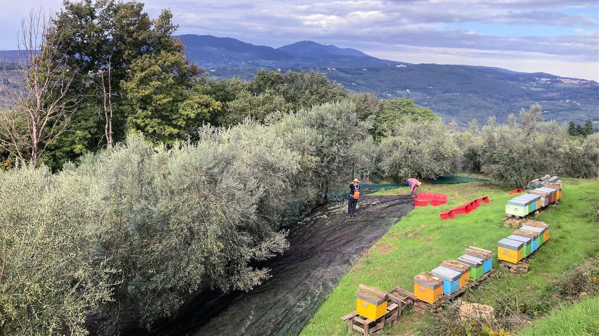 Hives bordering an olive grove at Fattoria Poggio di Fiesole