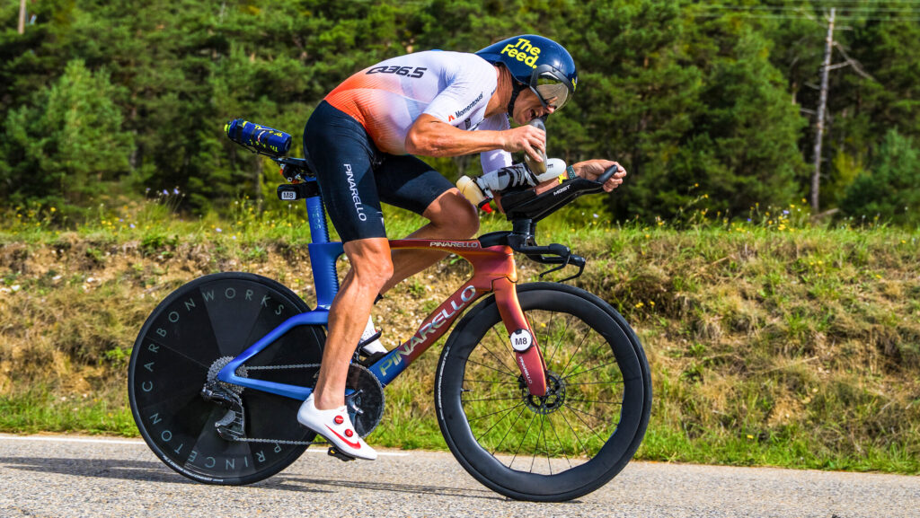 Casper Stornes fuels on the bike at the IRONMAN 70.3 World Championship in Marbella. Photo: Kevin Mackinnon