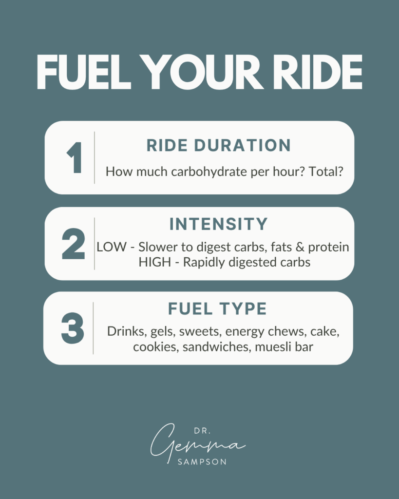So you might have an easy 3 hour base ride, but even if the intensity is low, the duration is long so you will need more fuel overall. You might need the same amount of fuel for a 90 minute ride that is high intensity. Interestingly, Dr. Sampson suggests considering the type of fuel too. The higher the intensity, the faster absorbing liquid fuels might be better, but on a long easy base ride, a granola bar might be a good choice.