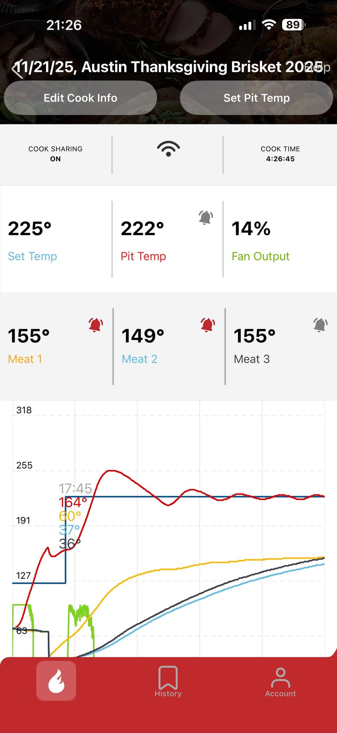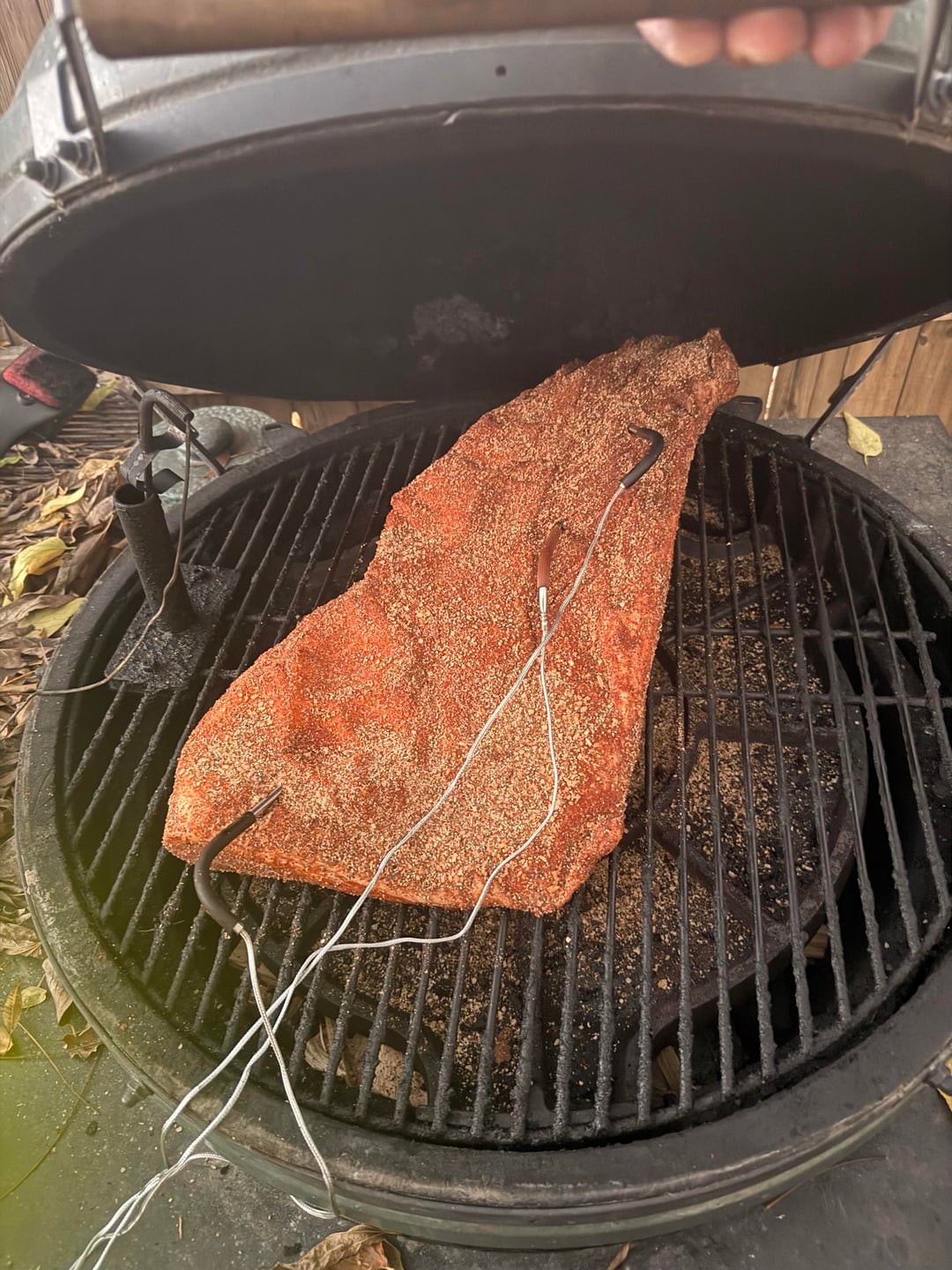 Got home from work today, cleaned out the egg, added new lump (Rockwood and Jealous Devil), some hickory chunks…then lit the smoker and setup my Flame Boss. While it was coming up to temp, I trimmed the brisket, mixed up a new batch of my homemade rub, and rubbed the brisket down. Brisket was on smoke about 4 hours ago….now I just wait for the temp alarms, so I can wrap and let it rest as we drive it to a family event in Austin. I do love smoking on the egg with a controller when I am tired. It keeps me from having to do anything at all!