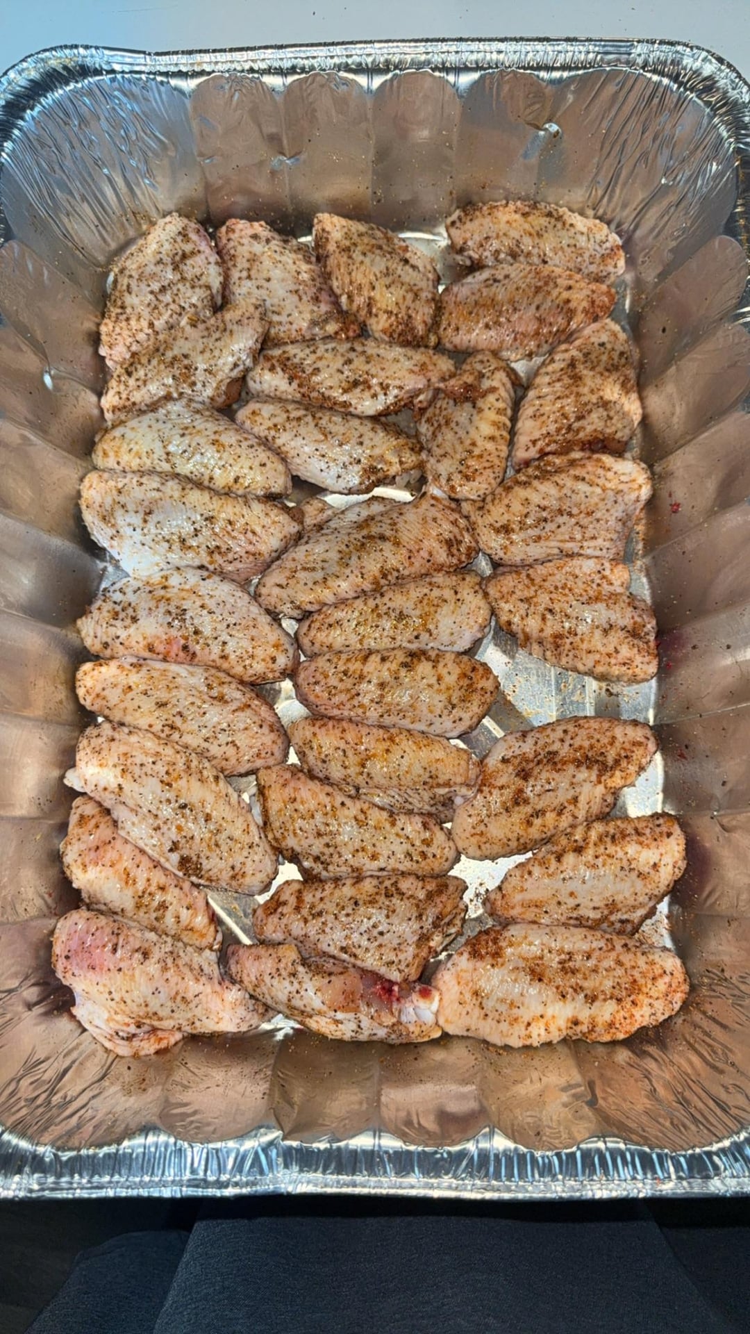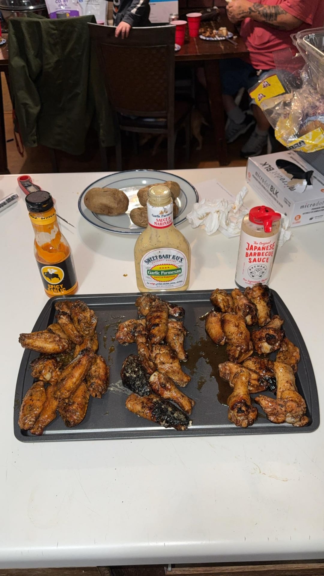 Used a mixture of Kosmos hot dirty bird dry rub with some classic seasoning salt and black pepper. Tossed with Japanese BBQ, Spicy Garlic from bdubs, and Garlic Parm.