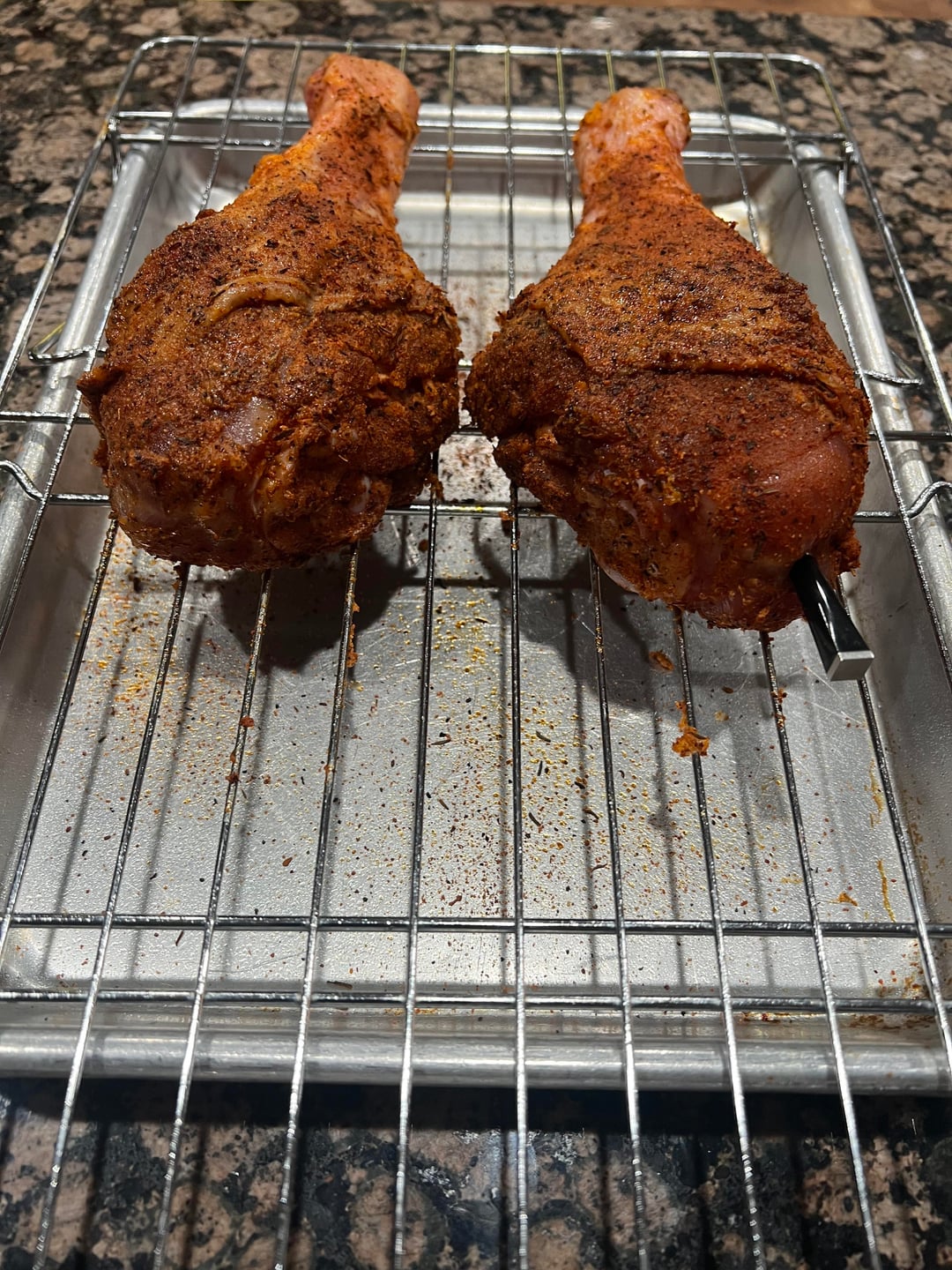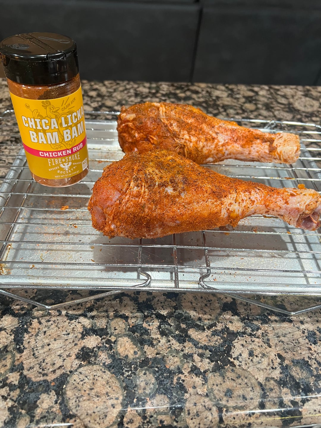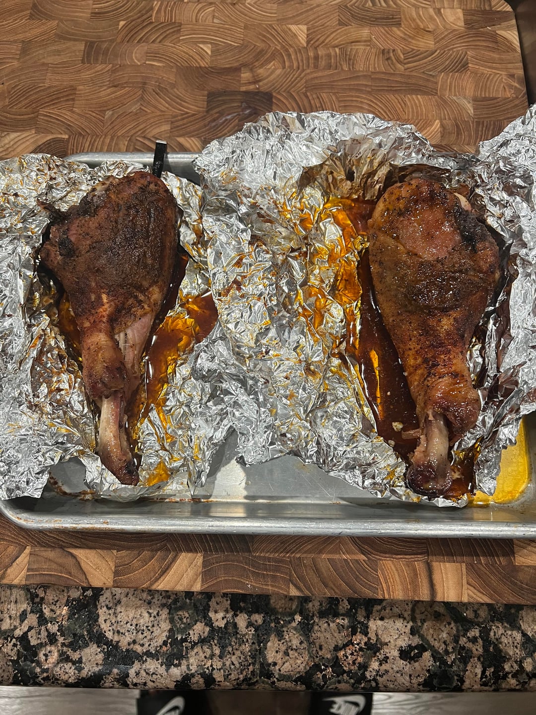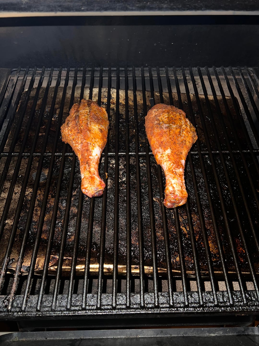 Cooked up some Smoked turkey legs. Injected butter and Chica Lika Bam Bam into the legs and let them sit out in the fridge overnight. Smoked them at 250 degrees with a Blend of Pecan and Apple pellets. Wrapped them in hot honey, butter and more chica lika bam bam seasoning.