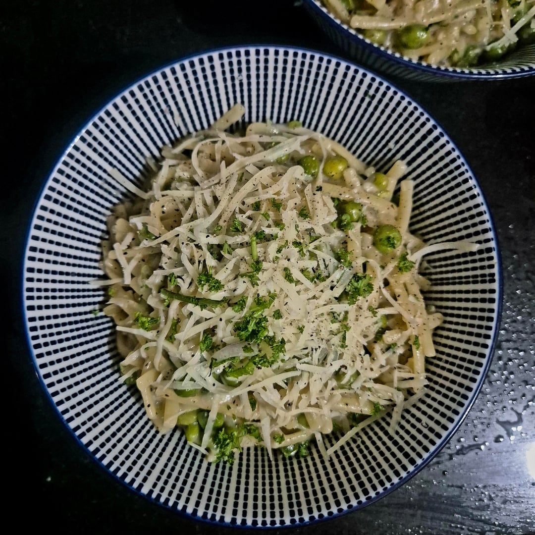 Absolutely fantastic again! Farfalle (bows) shaped pasta works fantastic with peas. Add some torn basil and the juice of half a lemon after plating and you’ve pretty much there
