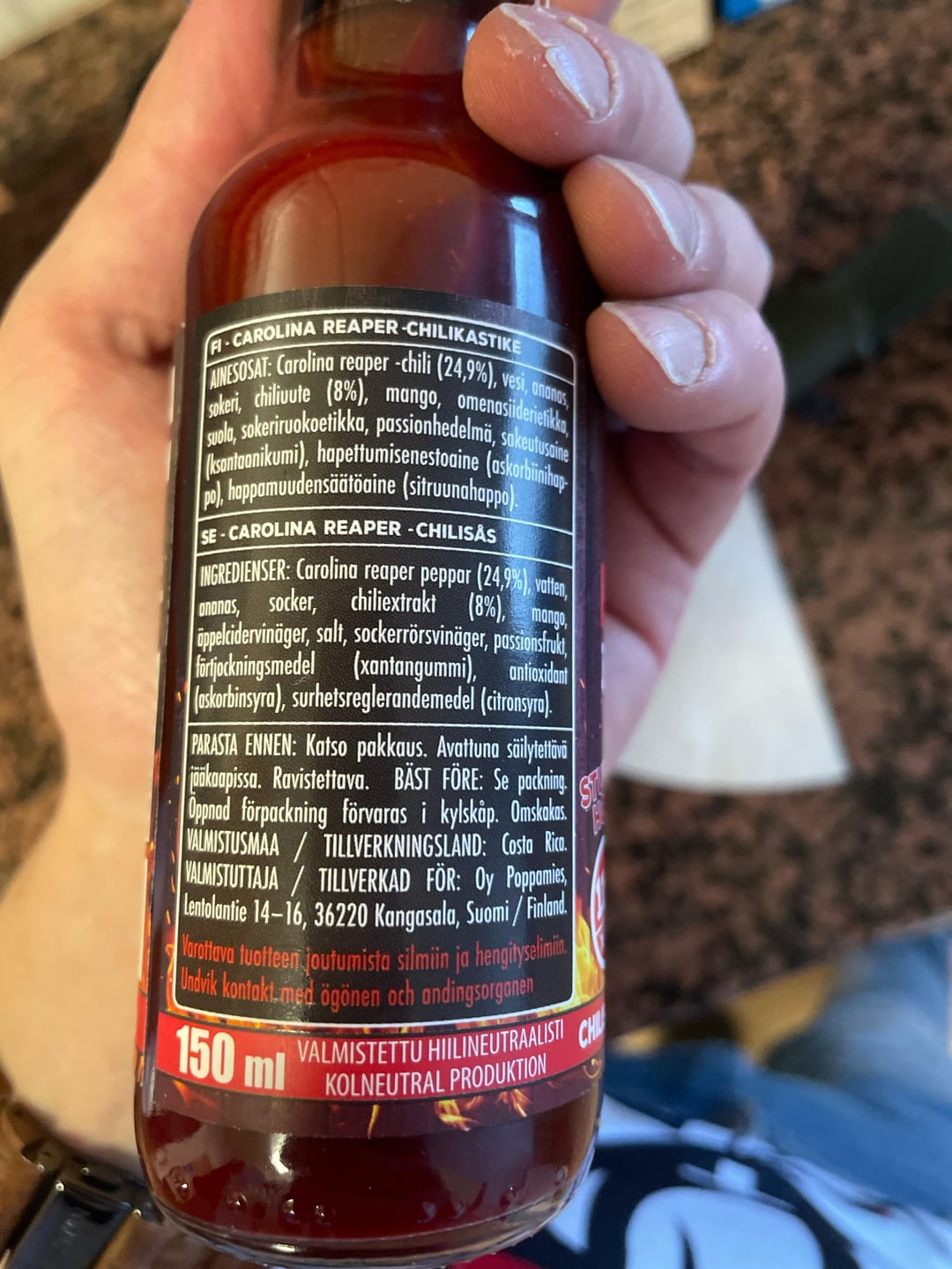 this one is pretty hot, with extracts. I didn’t really know with what to use this with but I recommend you their Poppamies Scorpion sauce, no extracts, better flavour and also a bit hotter.