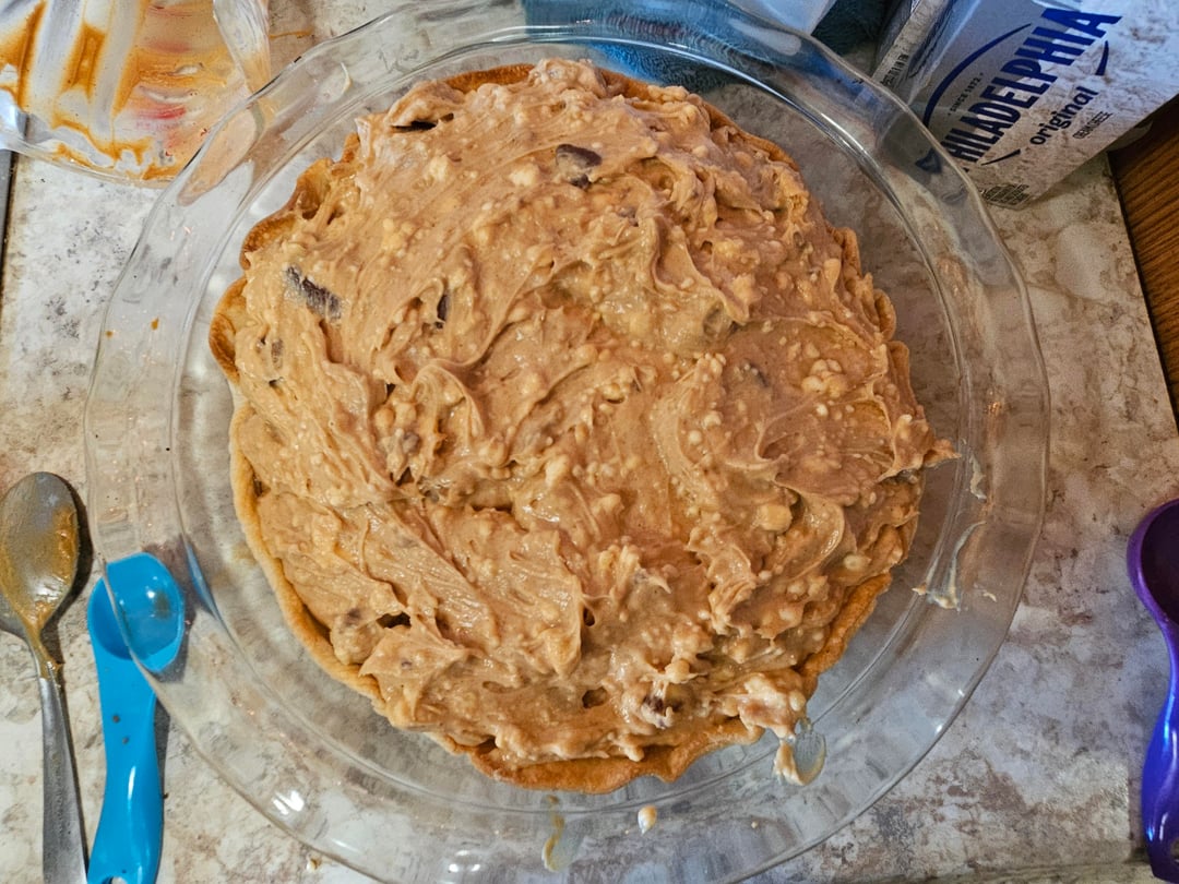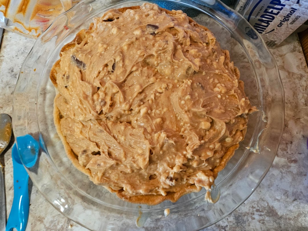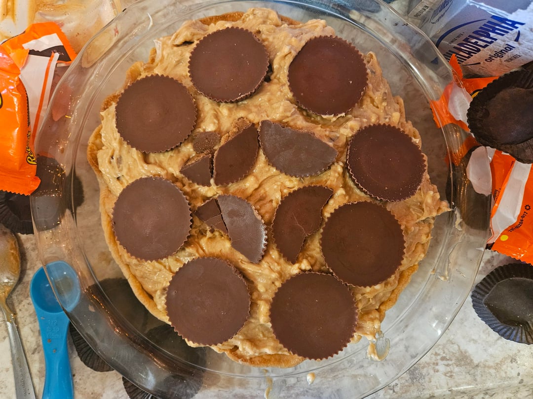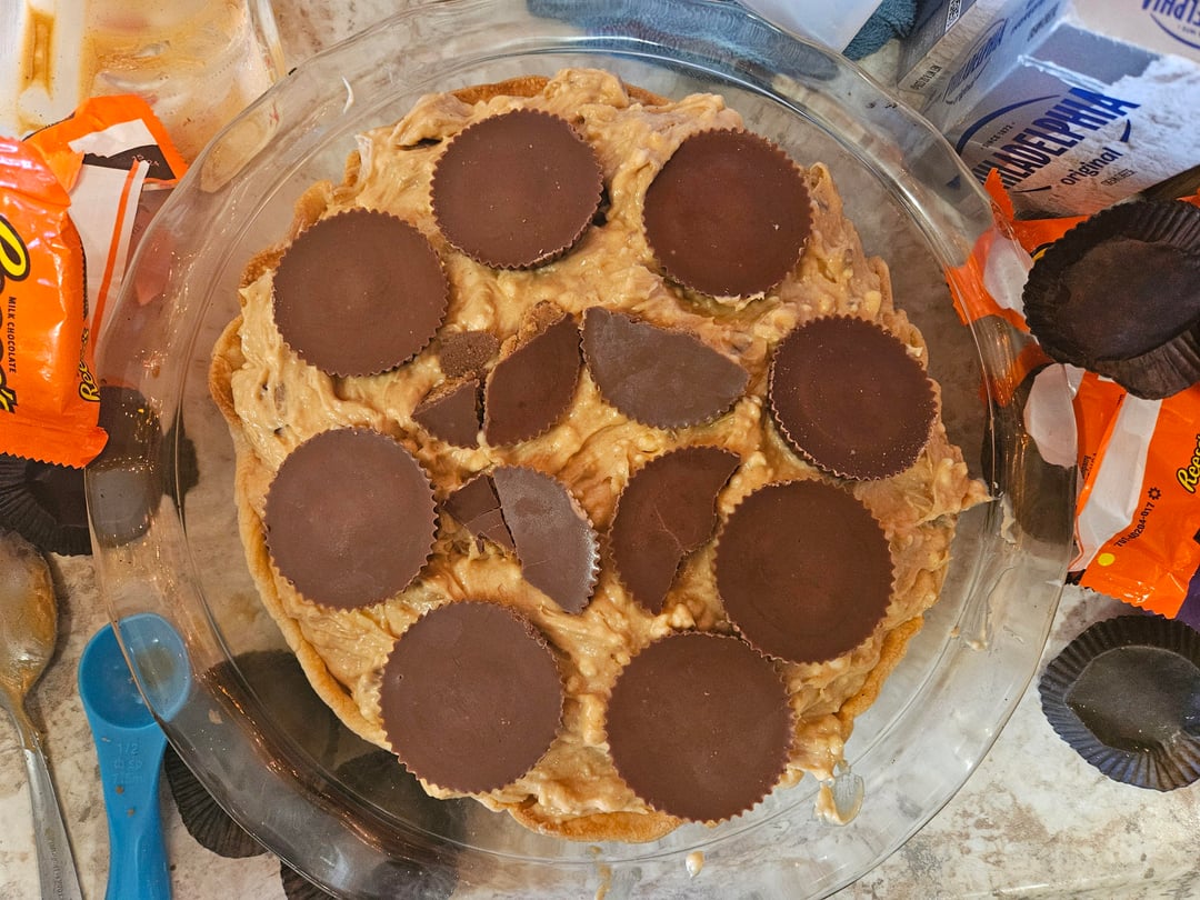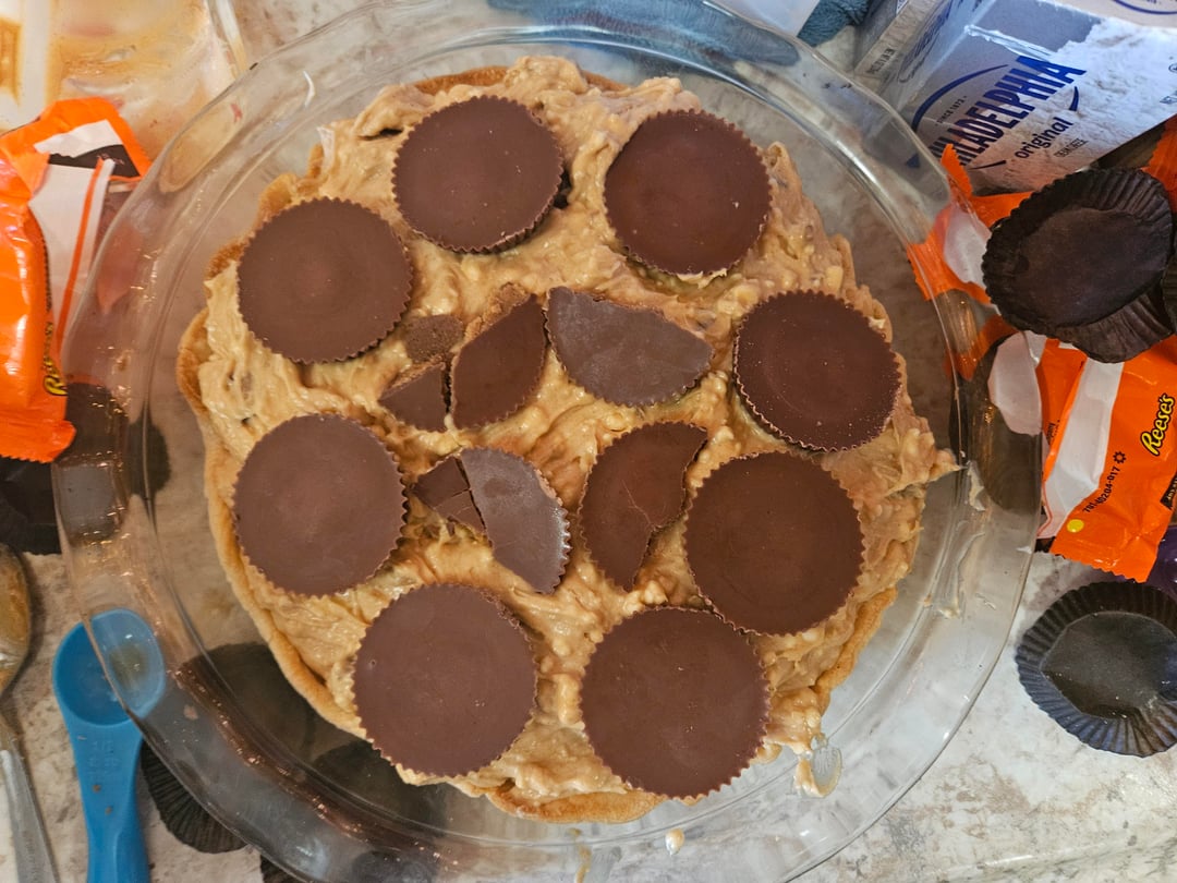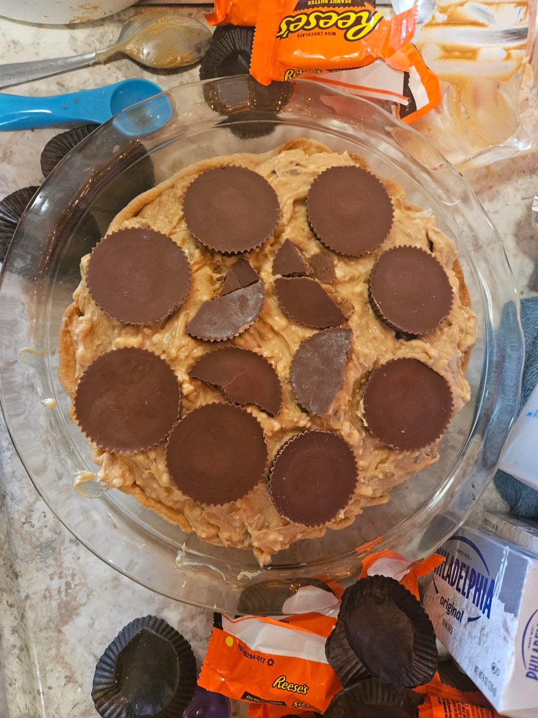 Today I will share an easy desser that anyone can make which is great for holidays and other occasions. It's a Reeses peanut butter pie with reeses peanut butter chocolate cups where you begin by baking a normal pie crust or by making one from graham crackers by mixing together a pack to pack and a half of graham crackers them with half a stick of unsalted butter (or buy a pre-made one if you want). Then for the filling, mix a large container of cool whip with a one pack, a pack and half, or two of of cream cheese and 3/4 of a cup of creamy peanut or more or less depending on how much of the peanut butter taste you want with a half to full cup of sugar and two teaspoons of vanilla extract and add some cushed Reese's cups to the mix and then fill the crust with the filling. Add Reese's cups on top of the filling and cover it in chocolate syrup if you want and you're good to go. Once done, you should put it in the fridge for a few hours to let it cool.