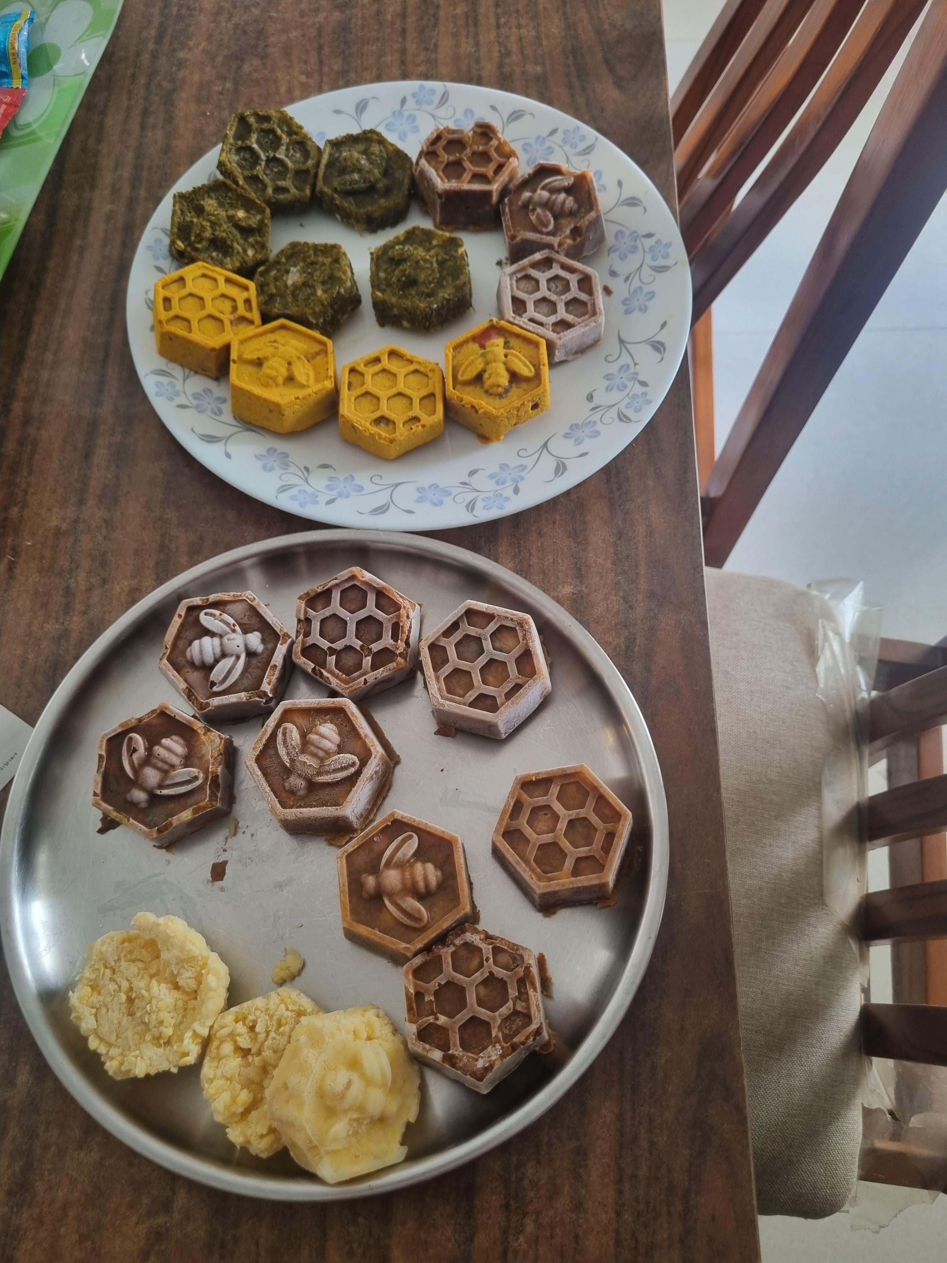 Frozen moong dal, sambar (with less water) , rajma masala, chole and zhoug . Frozen in my silicone tray.