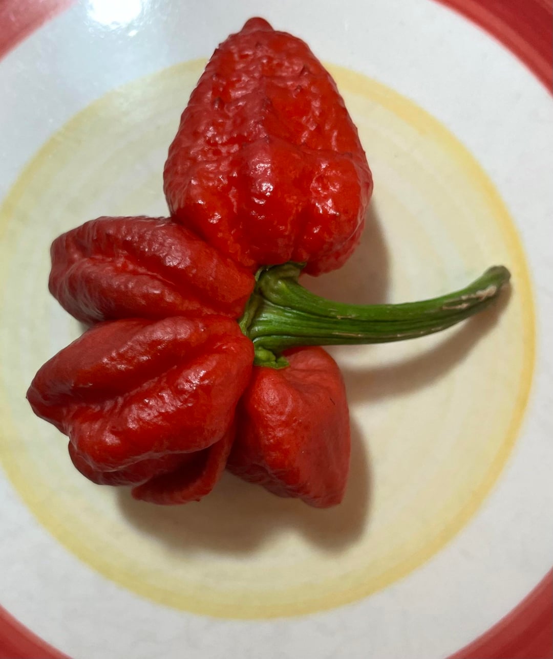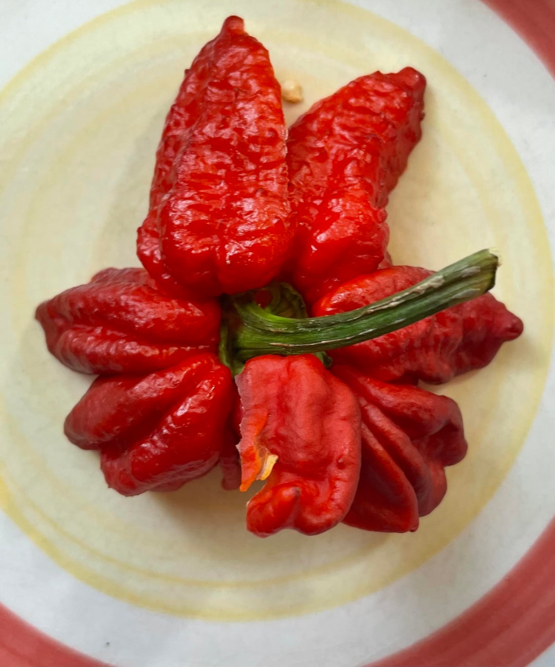 That's the weirdest pepper I've ever seen! It’s a Naga Twister Black. In addition to being fasciated, the peppers were devoid of anthocyanins; they were completely clear.