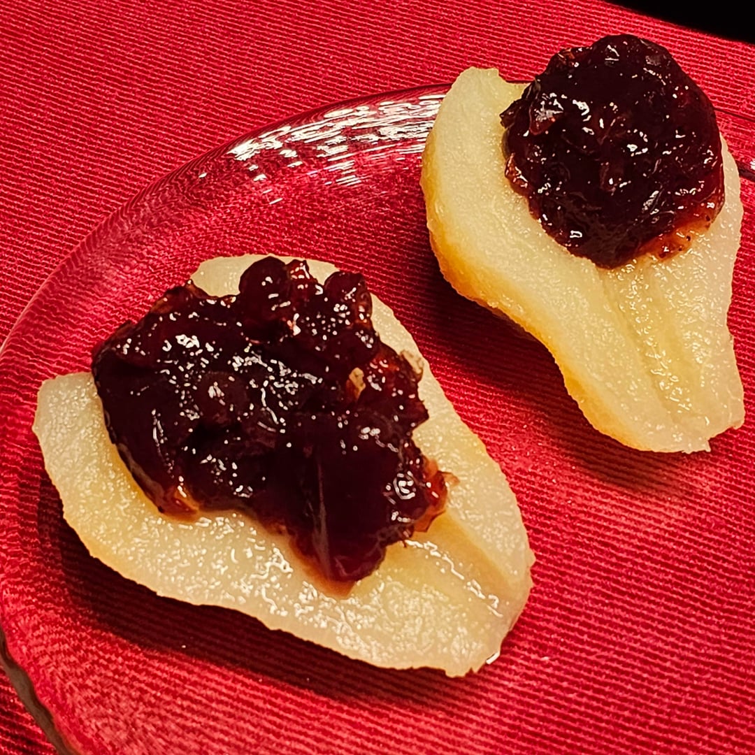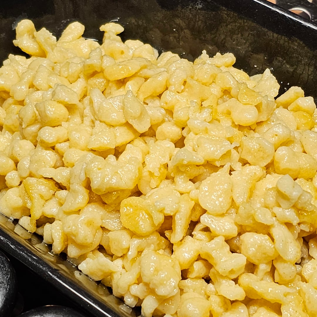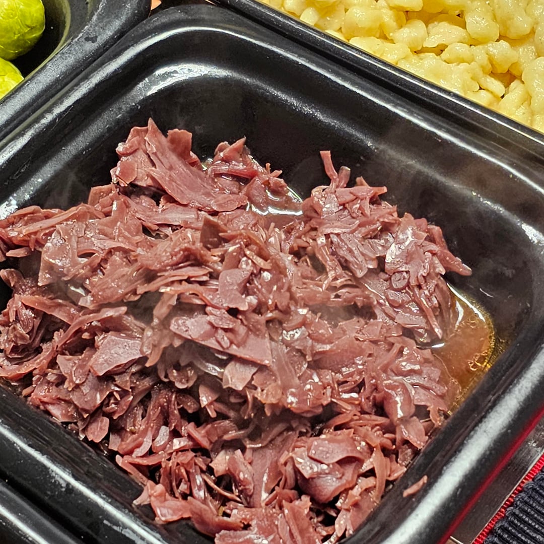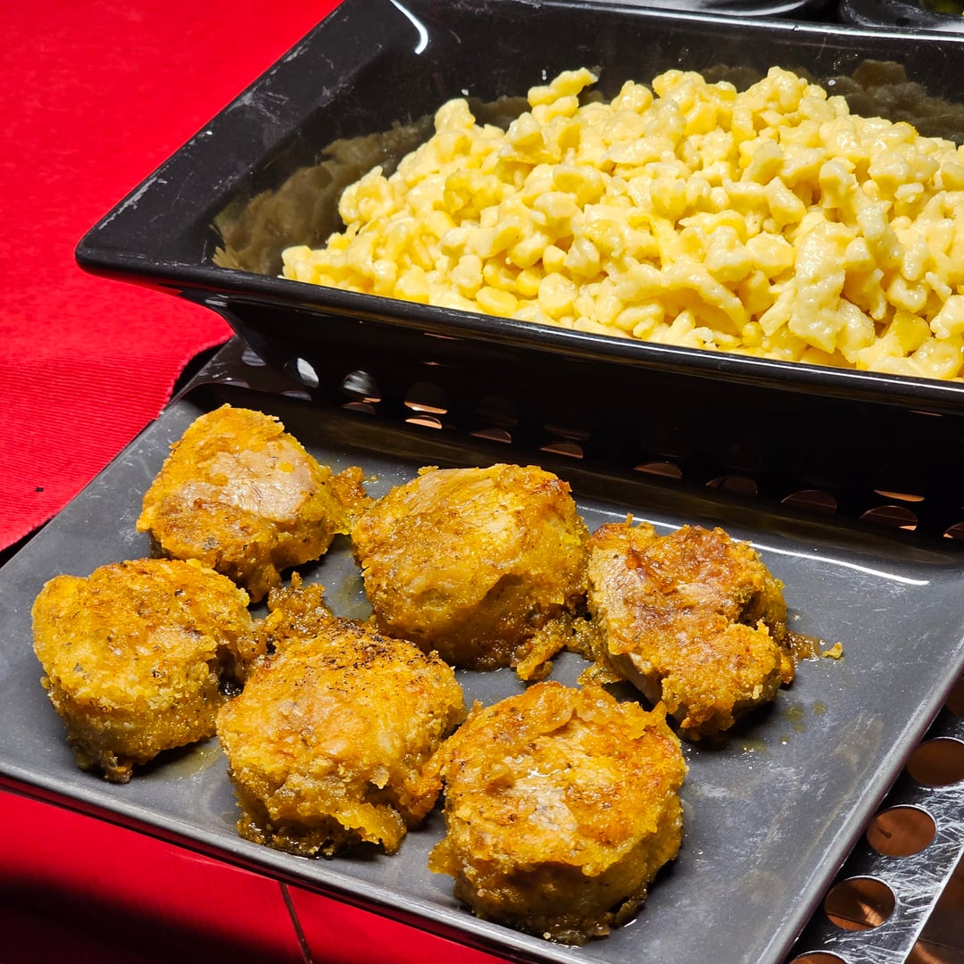 Low-temperature cooked pork fillet medallions with homemade Spätzle in a hearty, creamy white-wine and porcini sauce, served with red cabbage, Brussels sprouts and glazed chestnuts, and to add some more contrast half pears with lingonberry