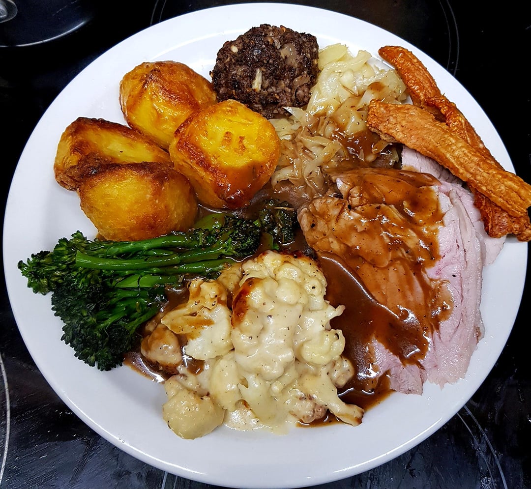 Sunday Roast Pork, Goose Fat Potatoes, Three Cheese Cauli Cheese, Sautéed Broccoli and Cabbage, and Stuffing. Pan and Cider Gravy.by pink_flamingo2003 Dining and Cooking