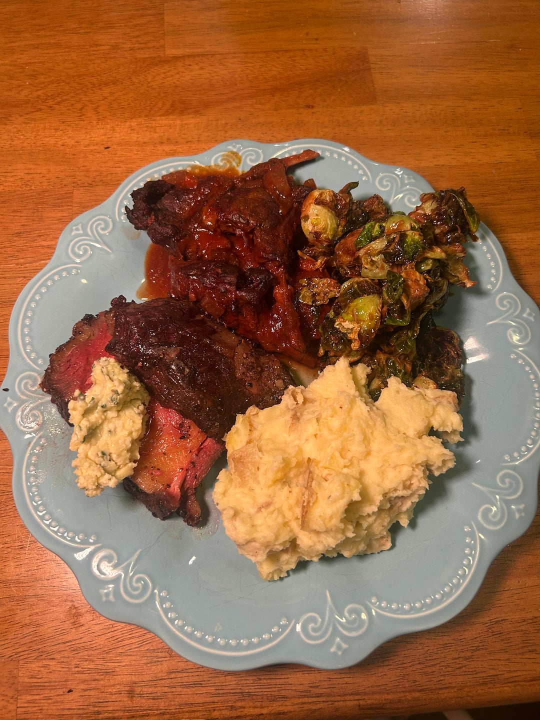 Served with some Gorgonzola herb compound butter, flash fried Brussels, potatoes, and some braised lamb (also from that dad)