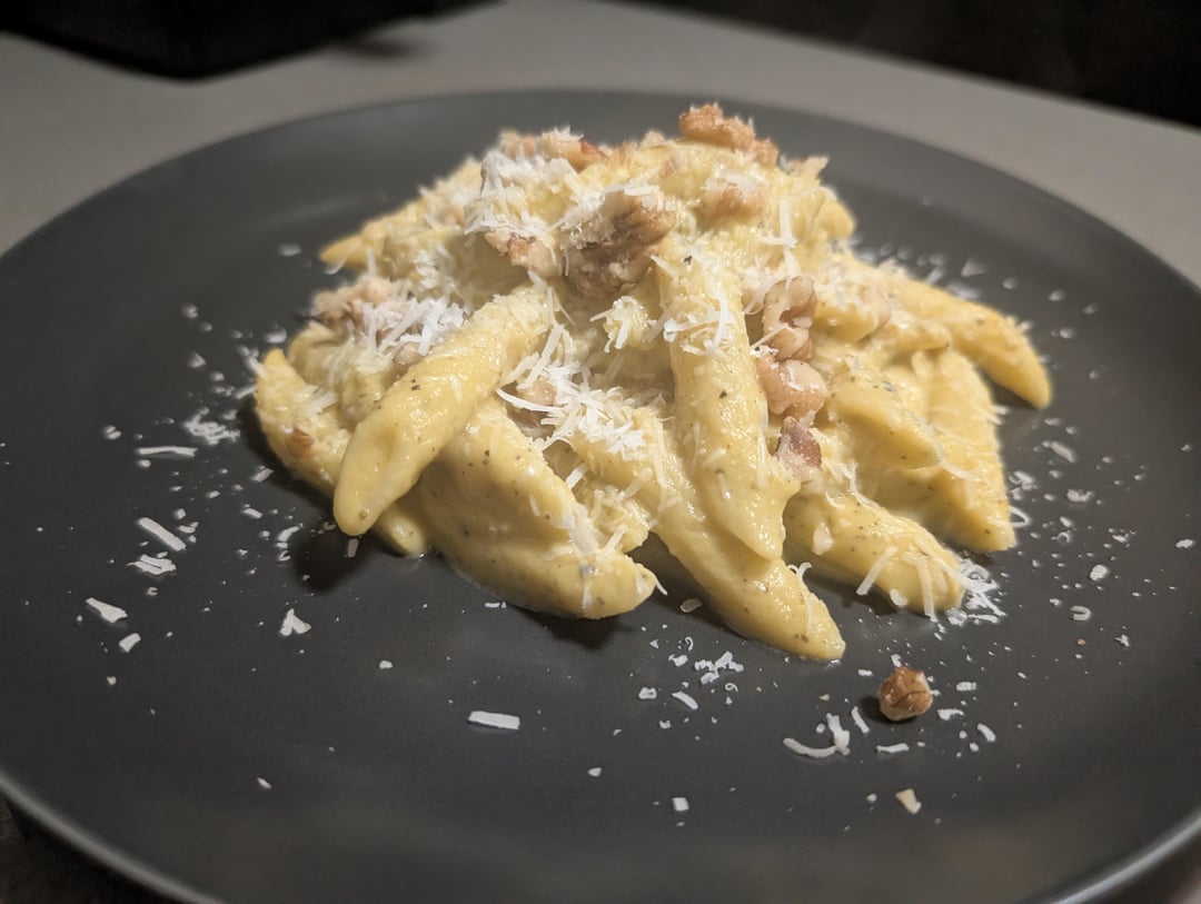 Took this from Vincenzo's plate with the pumpkin I had. Cut it up, roasted it with EVOO, rosemary, garlic, pepper. Blended it after roasting with a little more EVOO and pecorino to make a pumpkin cream sauce. A little pecorino and crushed walnuts on top after mixing. It wasn't bad, and was a nice way to use up the pumpkin.