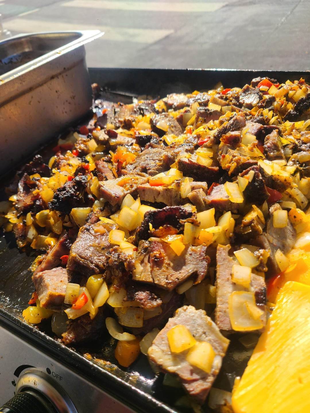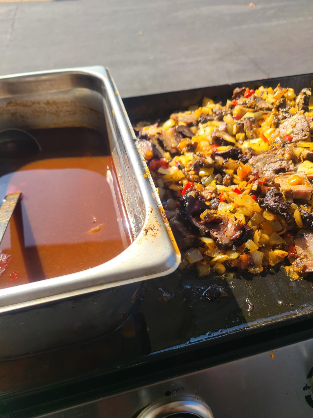 I call them "LA Cheesesteaks", smoked beef short rib, smoked and confit beef cheeks, onions, bell peppers, garlic and cheddar cheese on fresh baked, handmade rolls, with a handmade beef jus dipping sauce for $10, or 2 for $18. I have chips for $1, I had to sacrifice the space for sodas, for more room for sandwiches. I will hopefully soon figure out how to pack another cooler for drinks.
