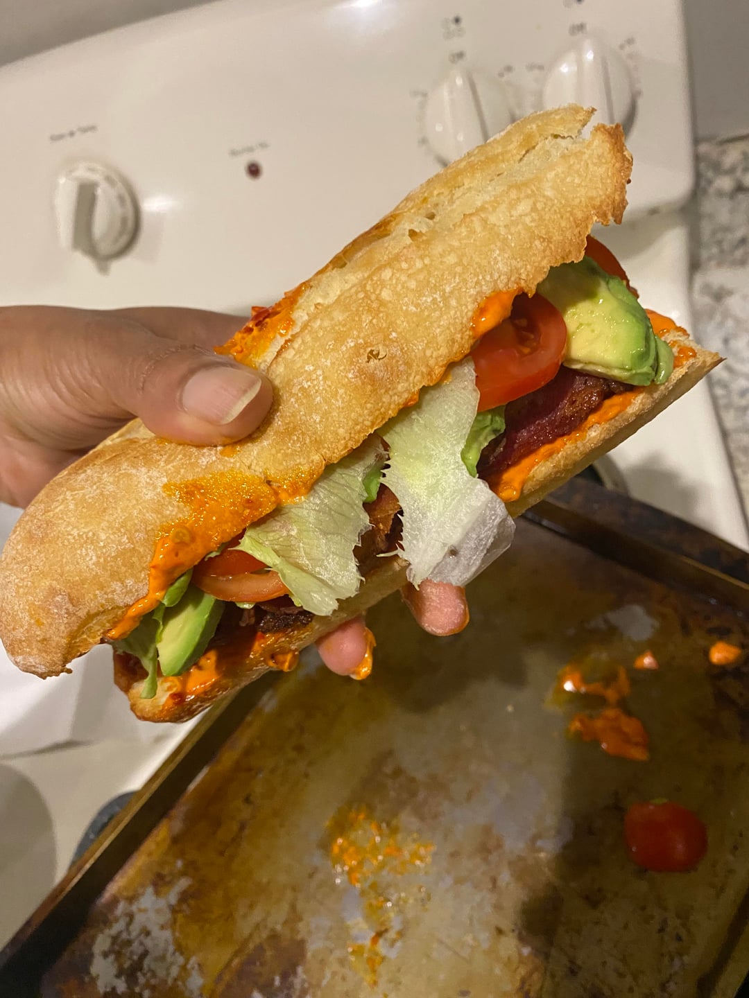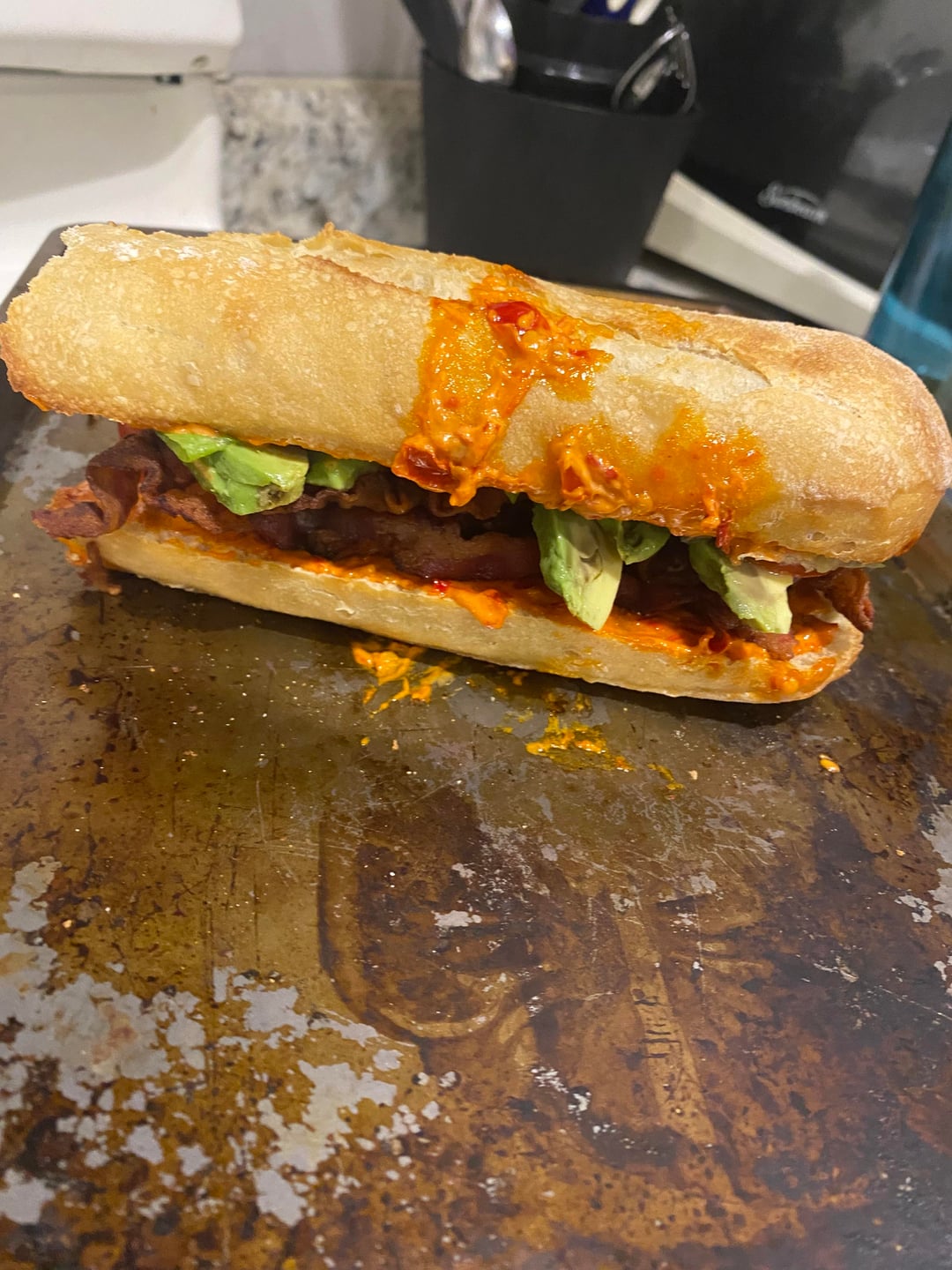 the ultimate blt on toasted baguette smeared with dukes mayo and calabrian peppers w/chili oil; smoked turkey & black forest ham w/ provolone cheese topped off with romaine, tomatoes & avocado.😋