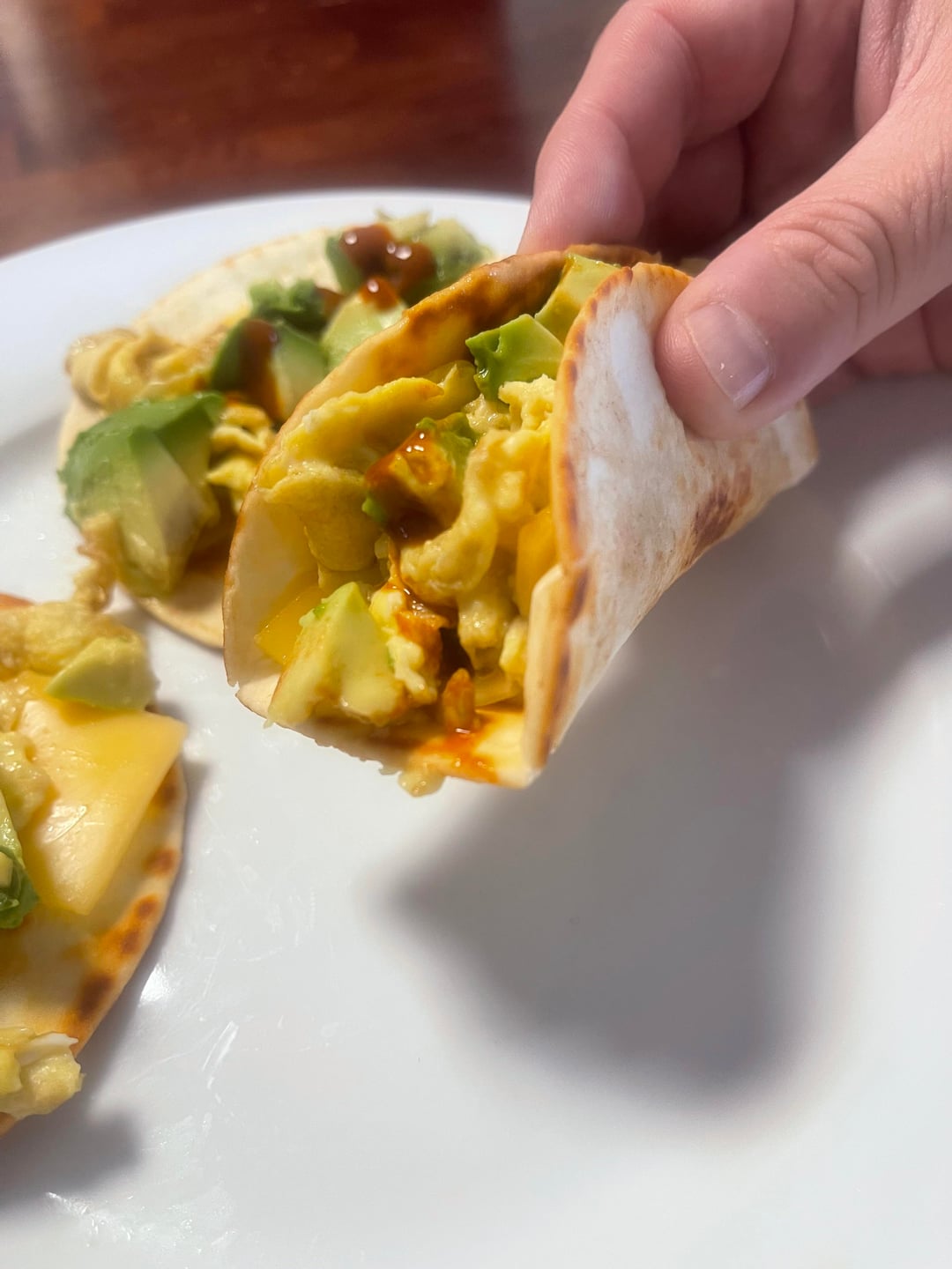 Breakfast tacos have eggs, Gouda cheese, avocado & Cholula