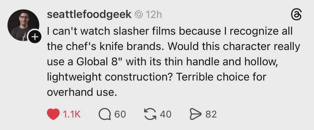 I started watching horror flicks around 8. I started working with a butcher at 12. My dad didn’t like to watch stabby movies with me after that.