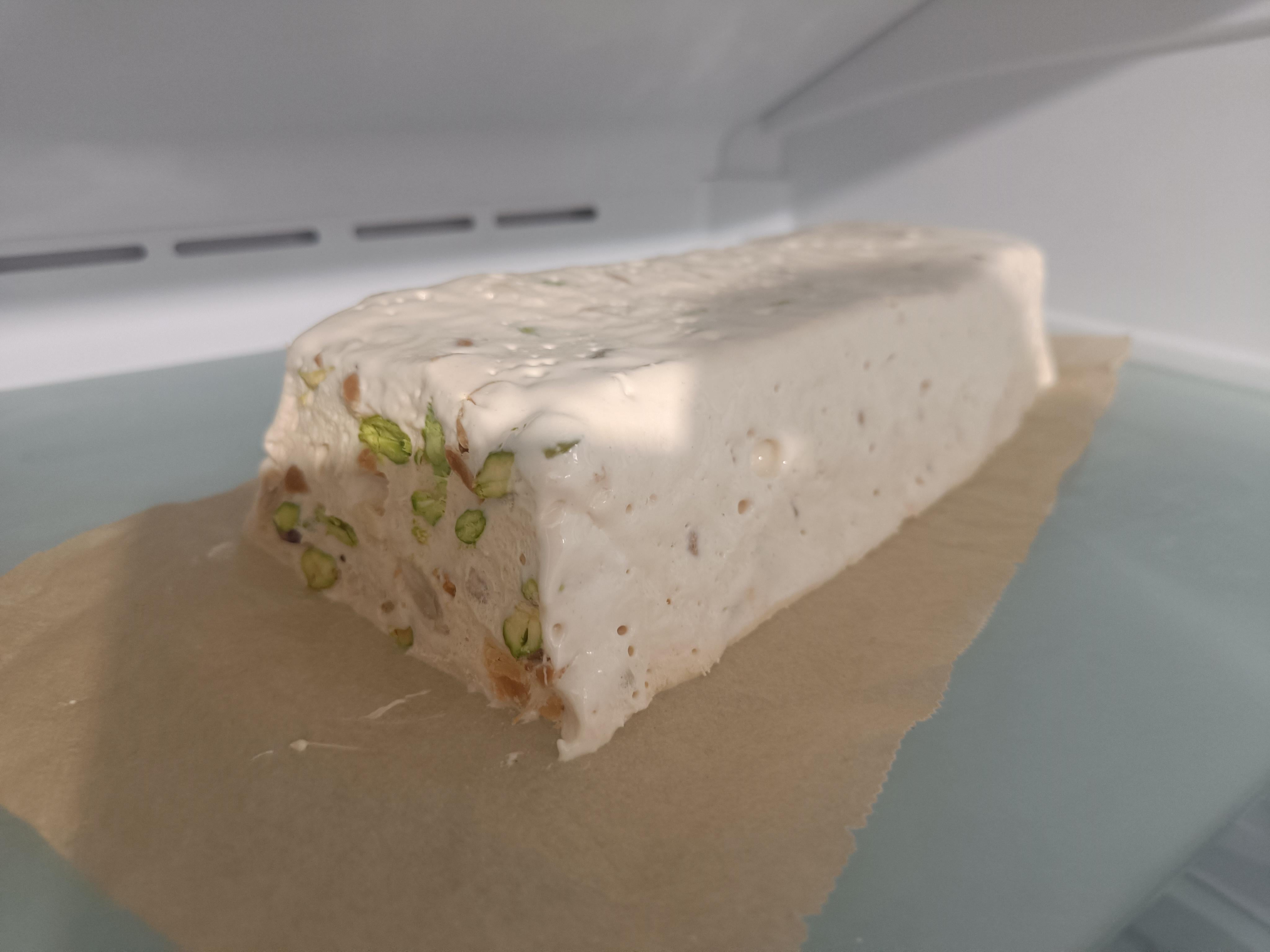 Refrigerate for half an hour (I noticed something wasn't right; after half an hour in the refrigerator, the dough was still soft. I managed to get a soft but firm nougat only after two hours in the freezer).